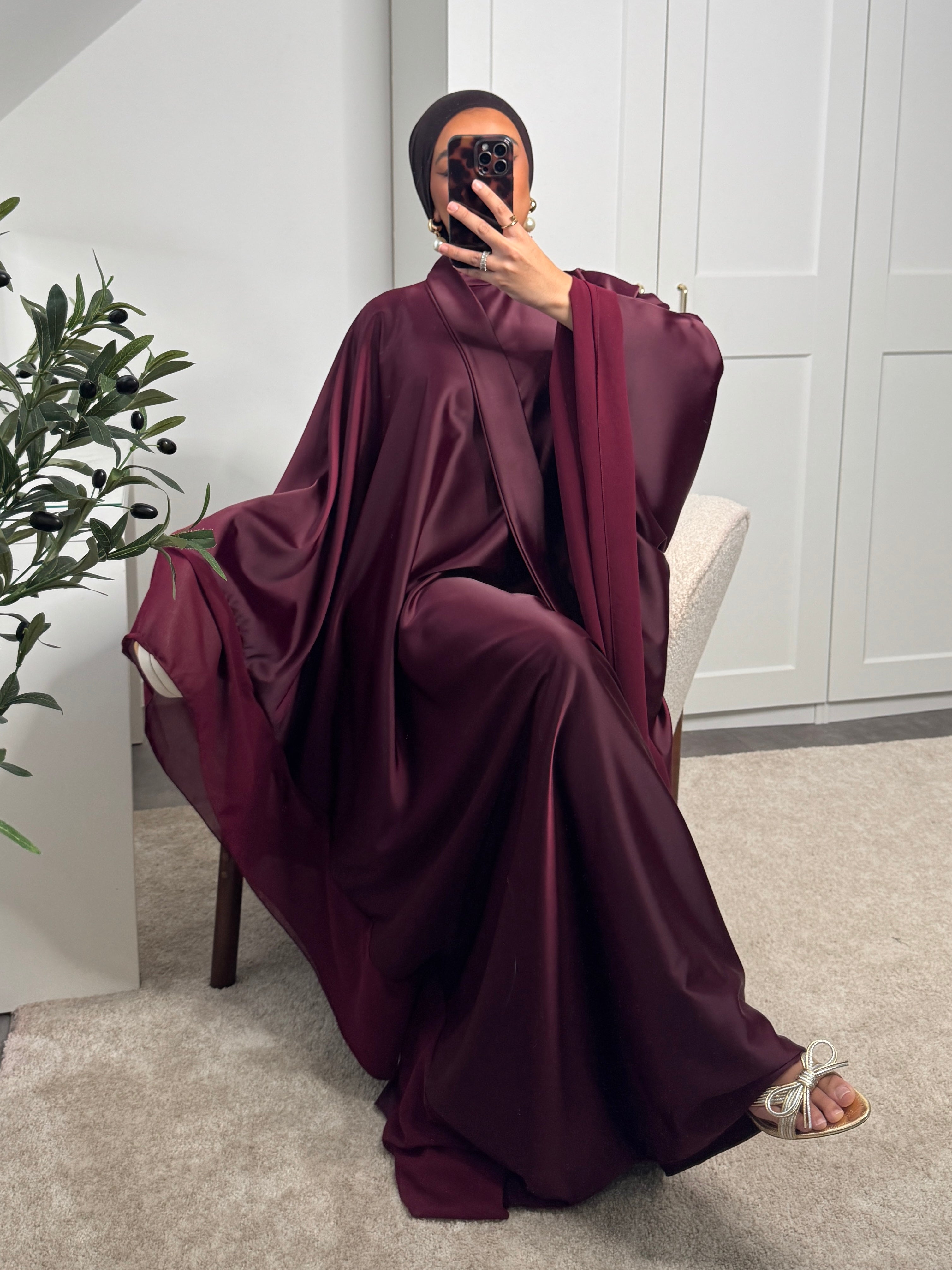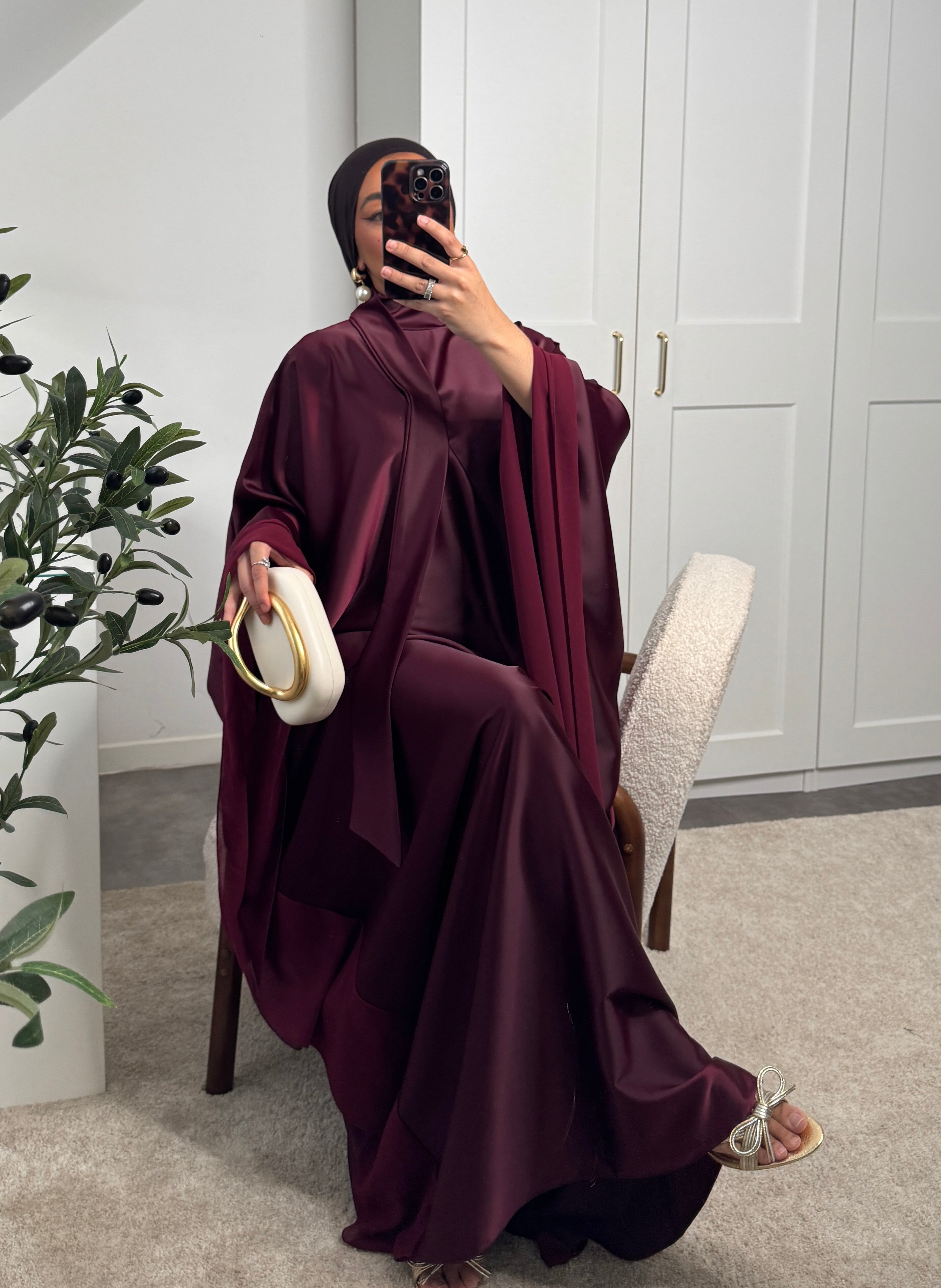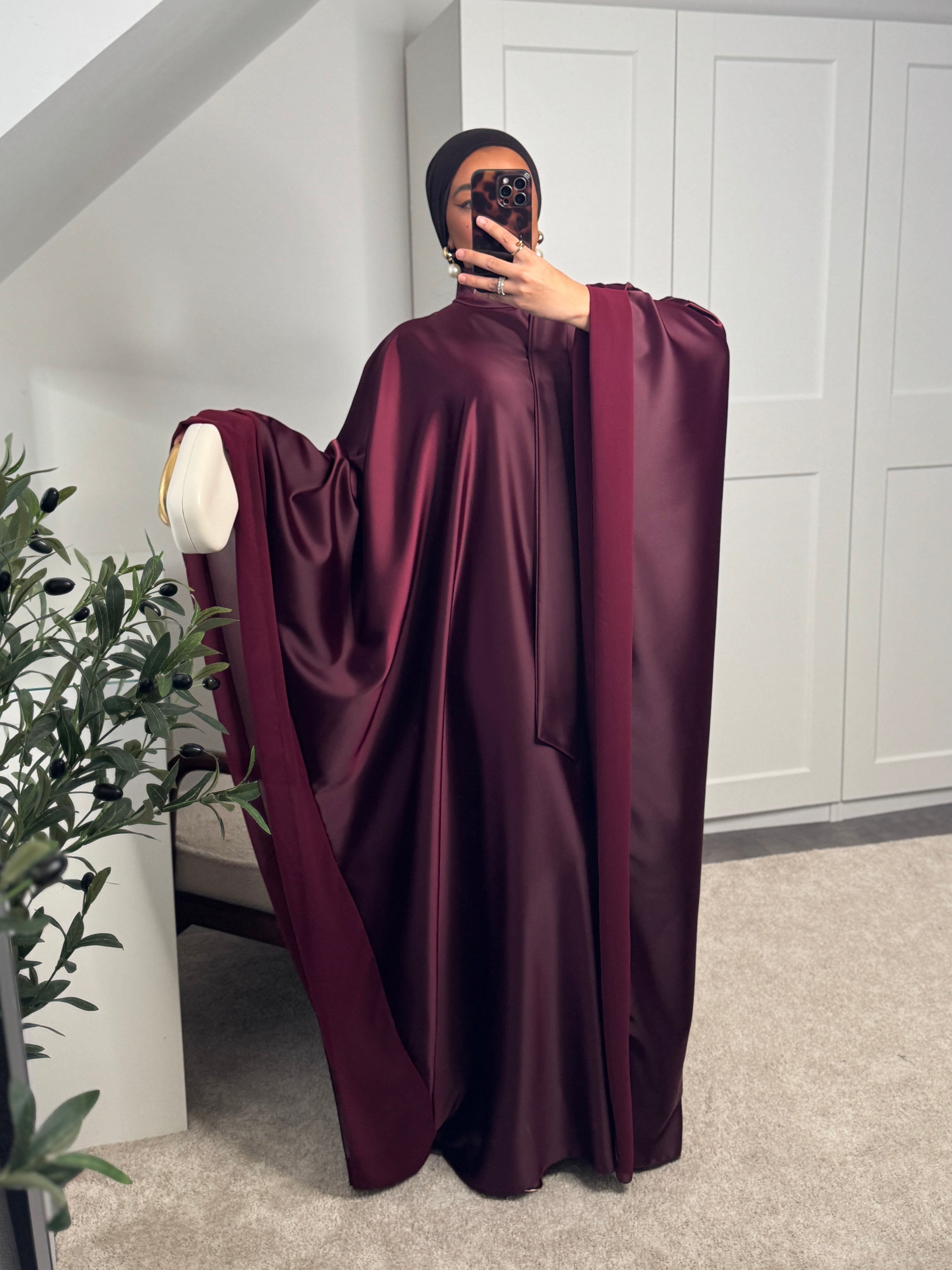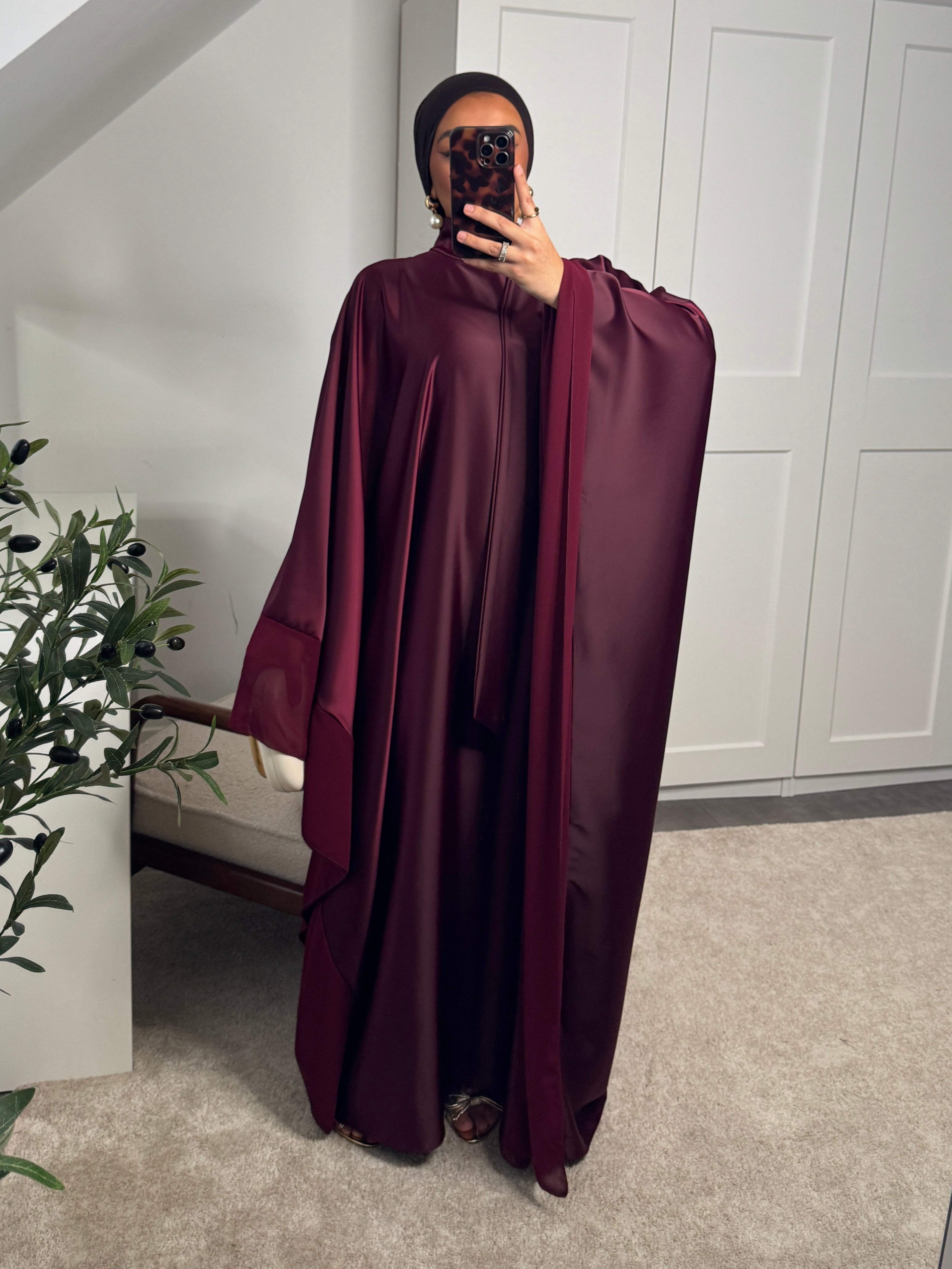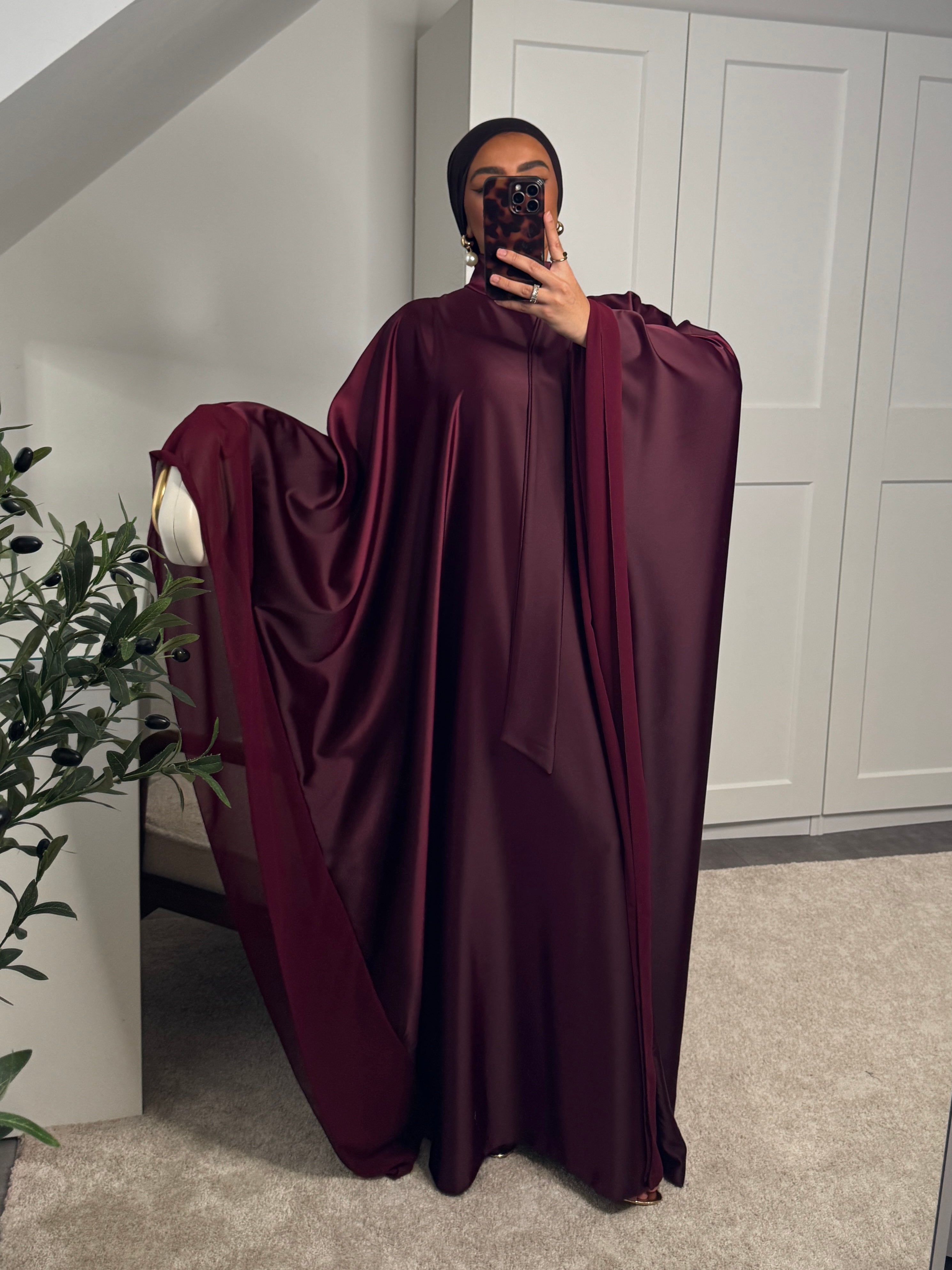 Actualiser la disponibilitéRobe abaya longue et oversize. Détails : col montant, manches papillons. Tissus : satin épais et mousseline.