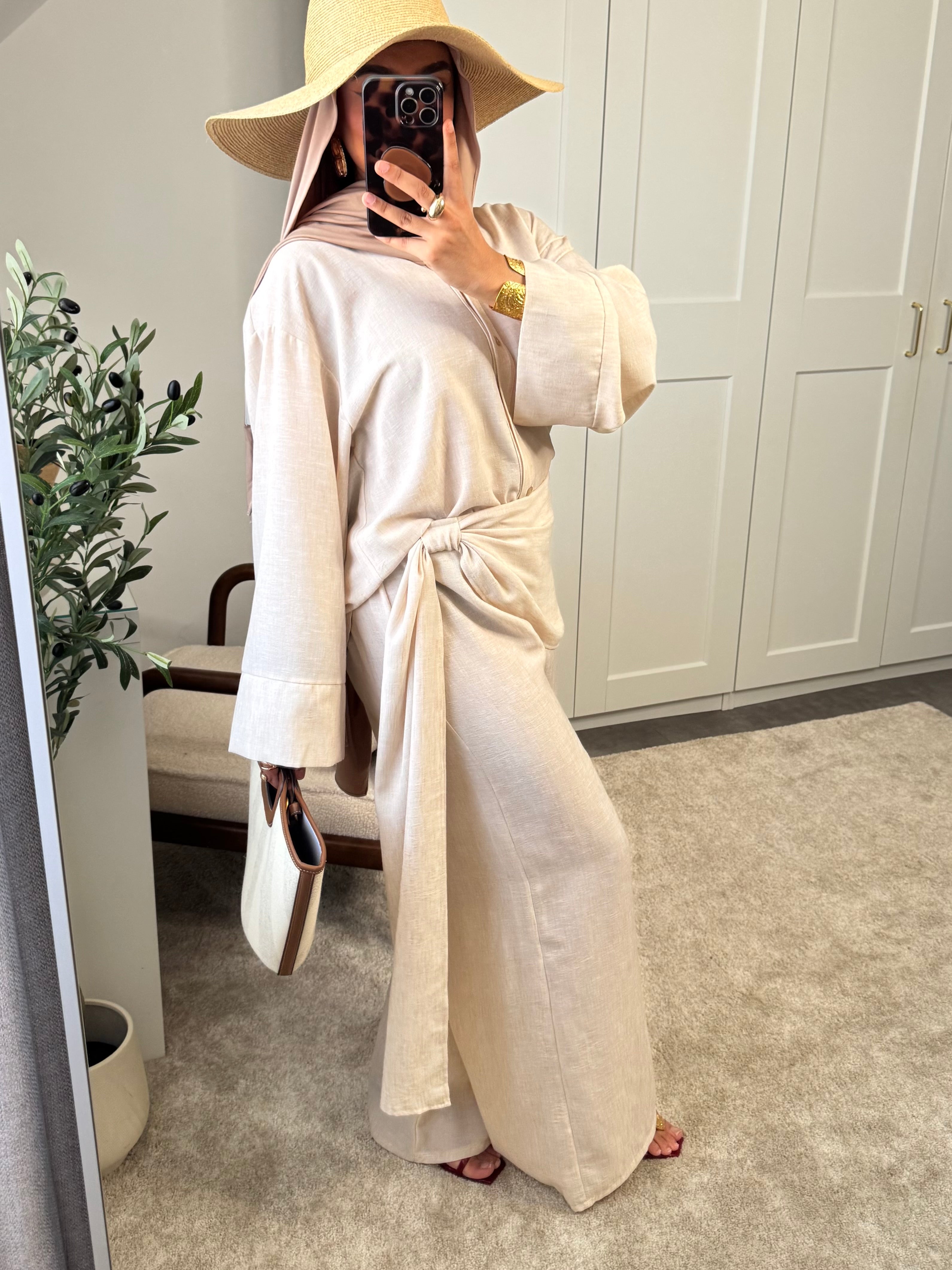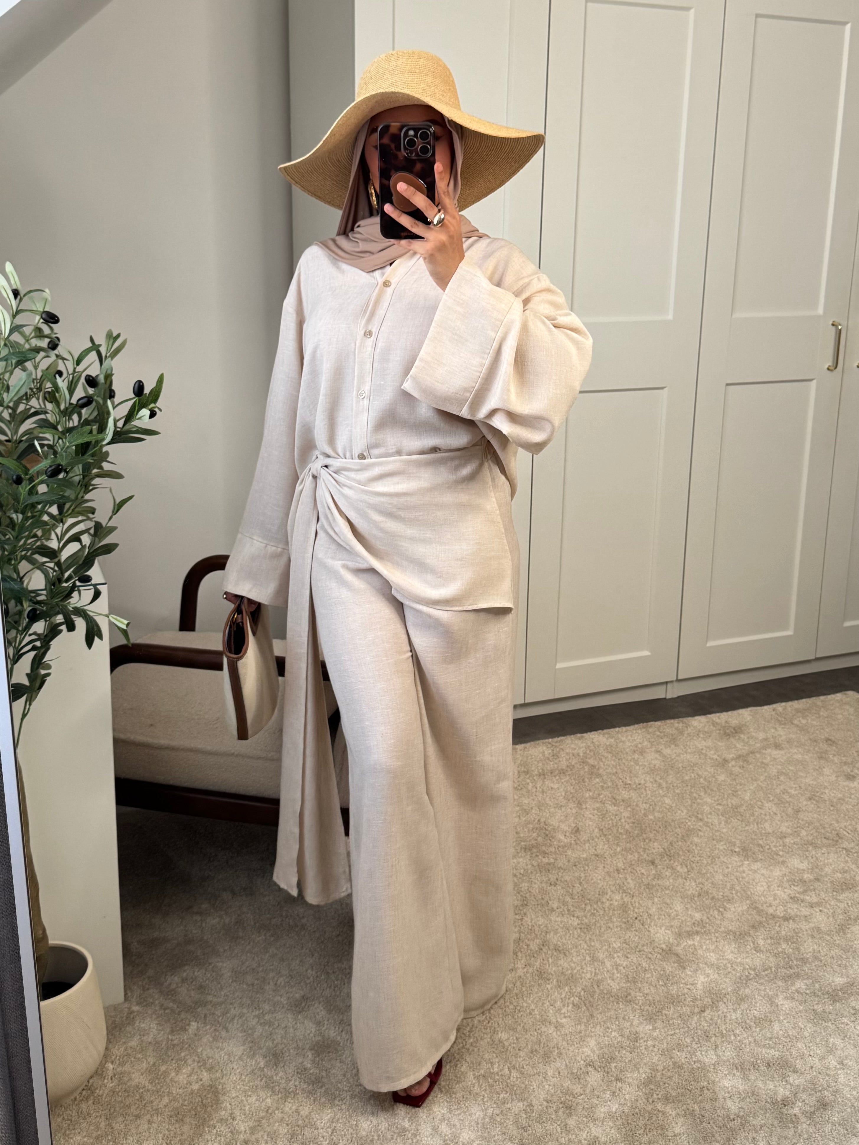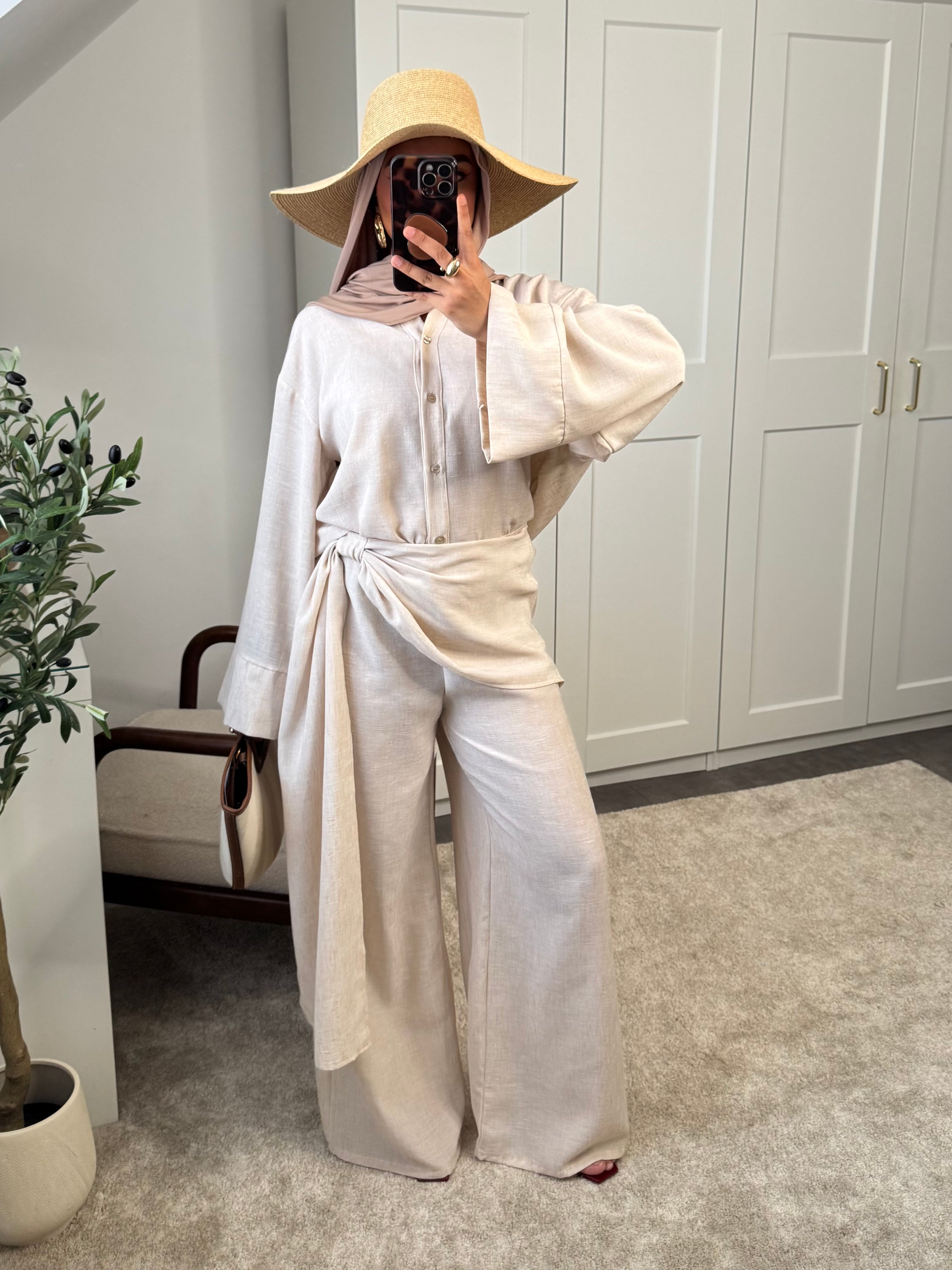 Actualiser la disponibilitéSet 2 pièces: chemise et pantalon effet paréo à l'avant - effet lin.