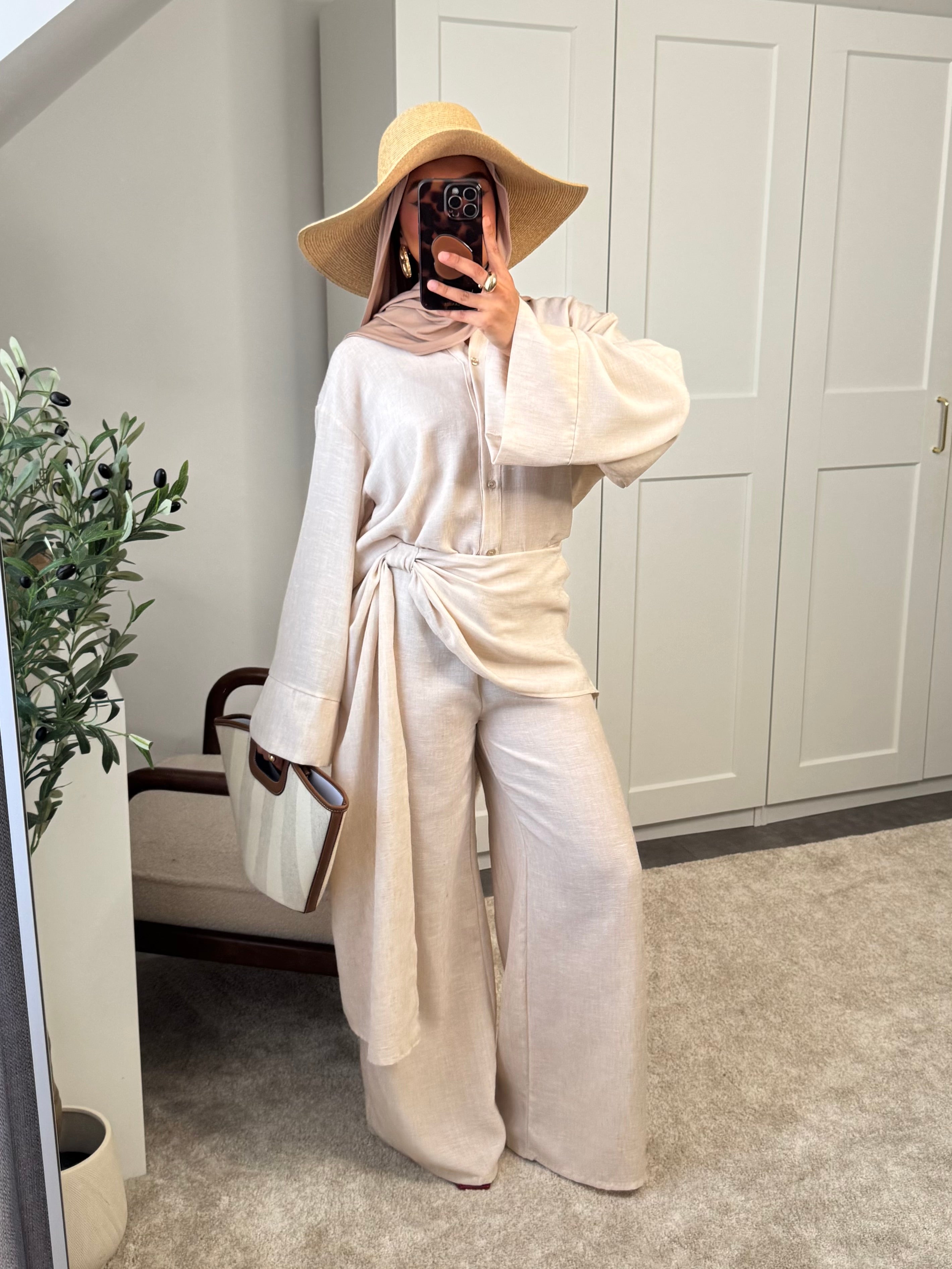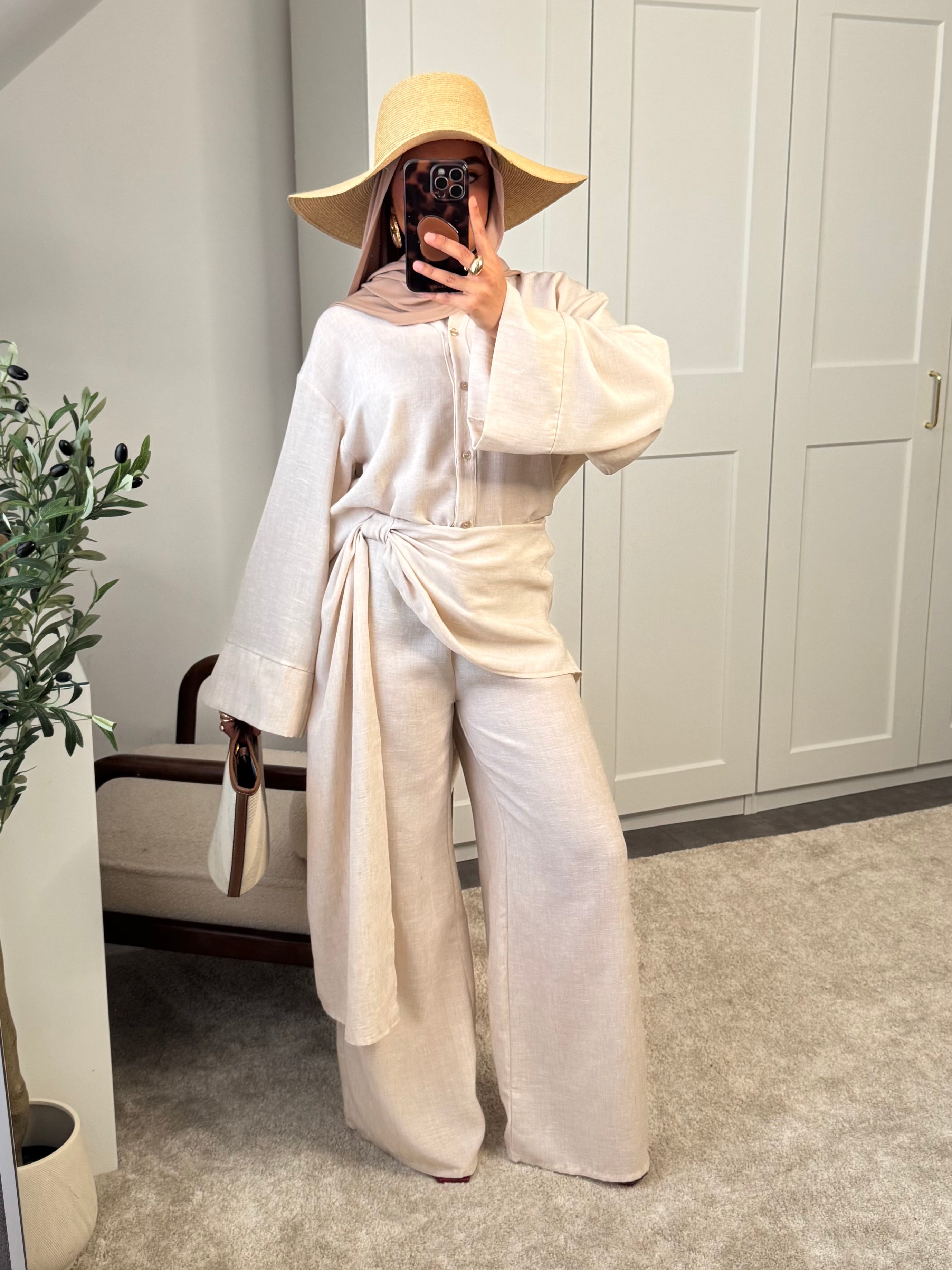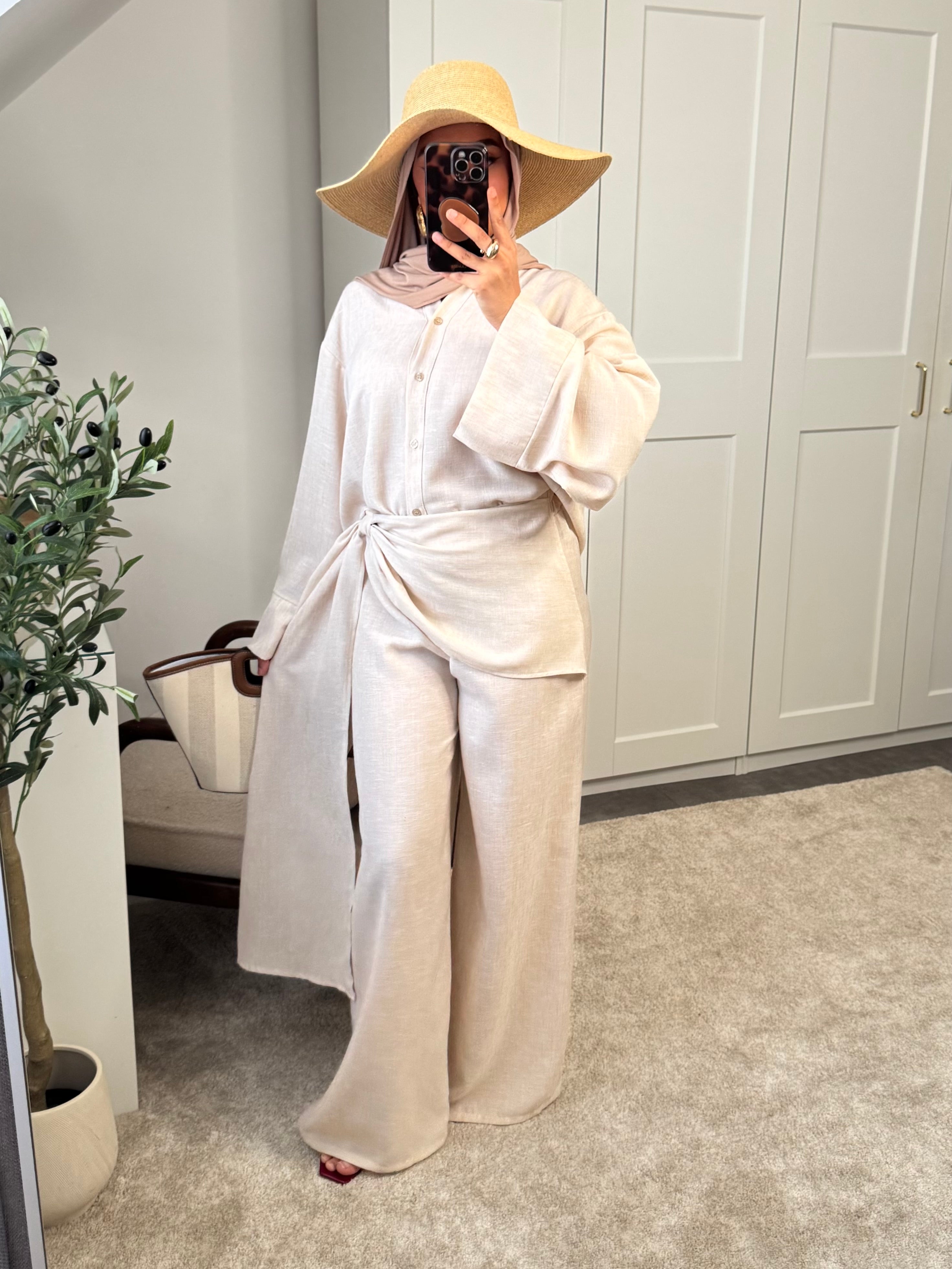 Actualiser la disponibilitéSet 2 pièces: chemise et pantalon effet paréo à l'avant - effet lin.