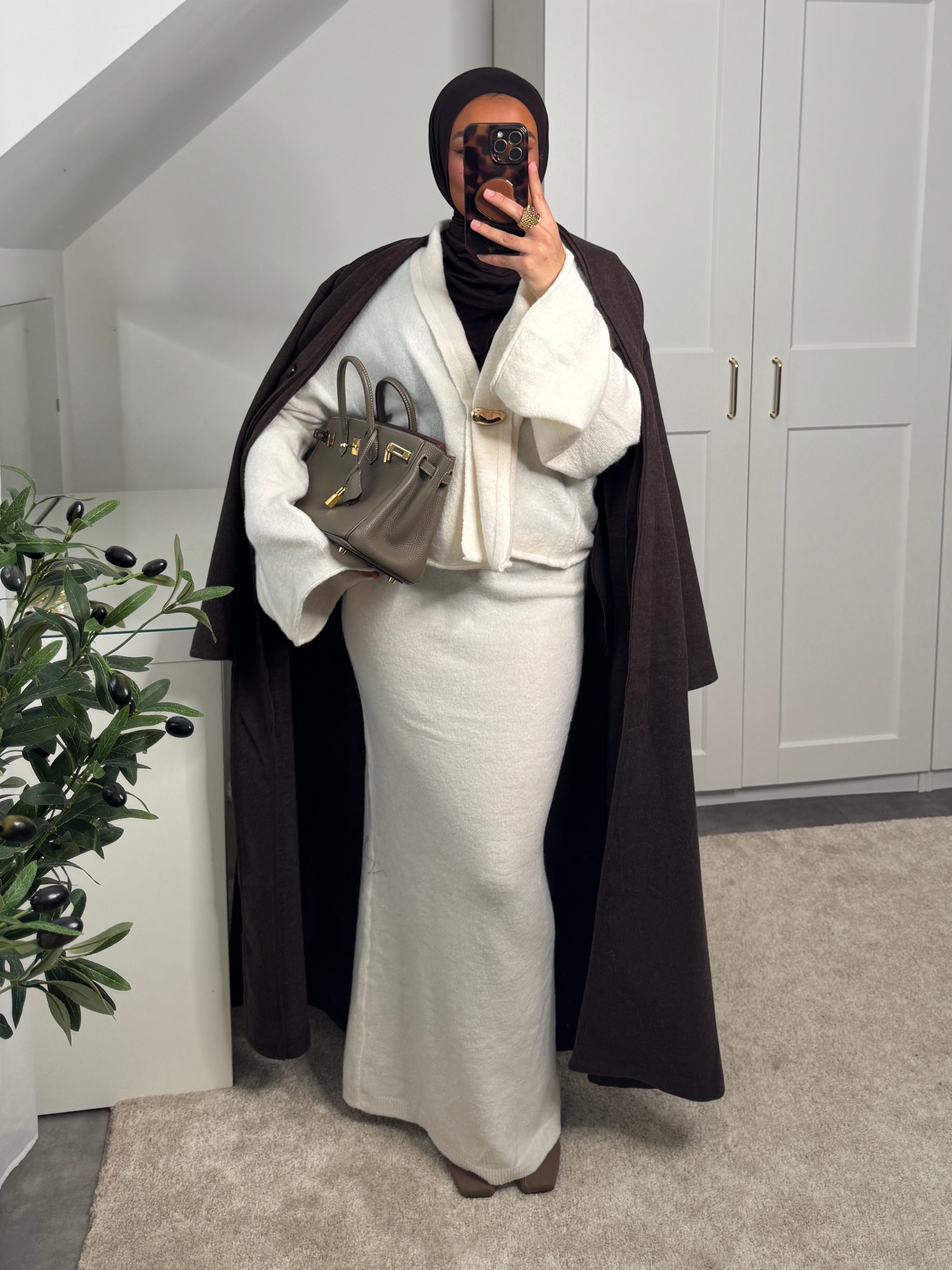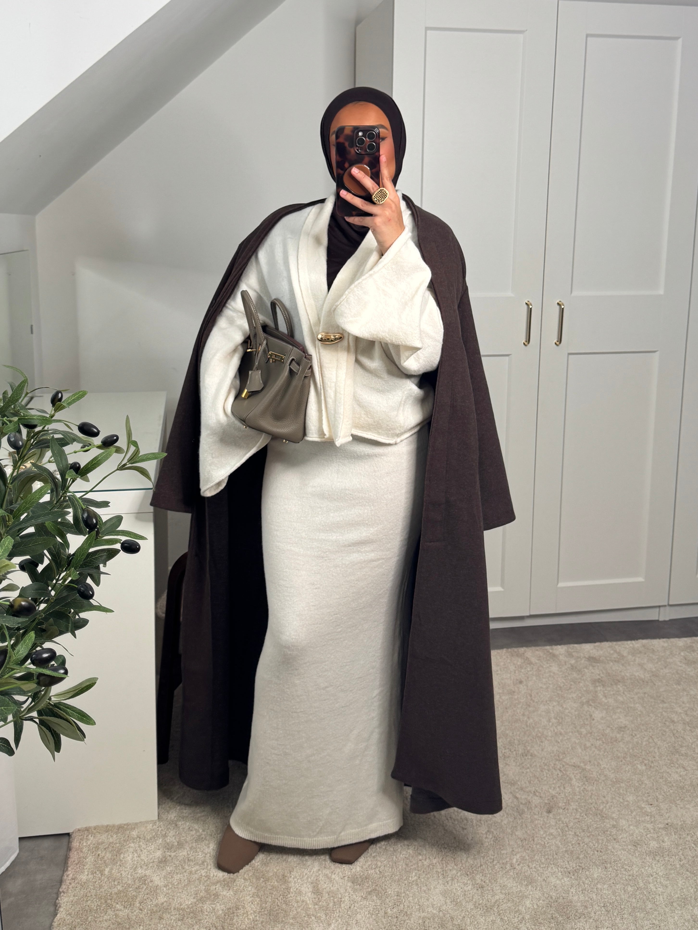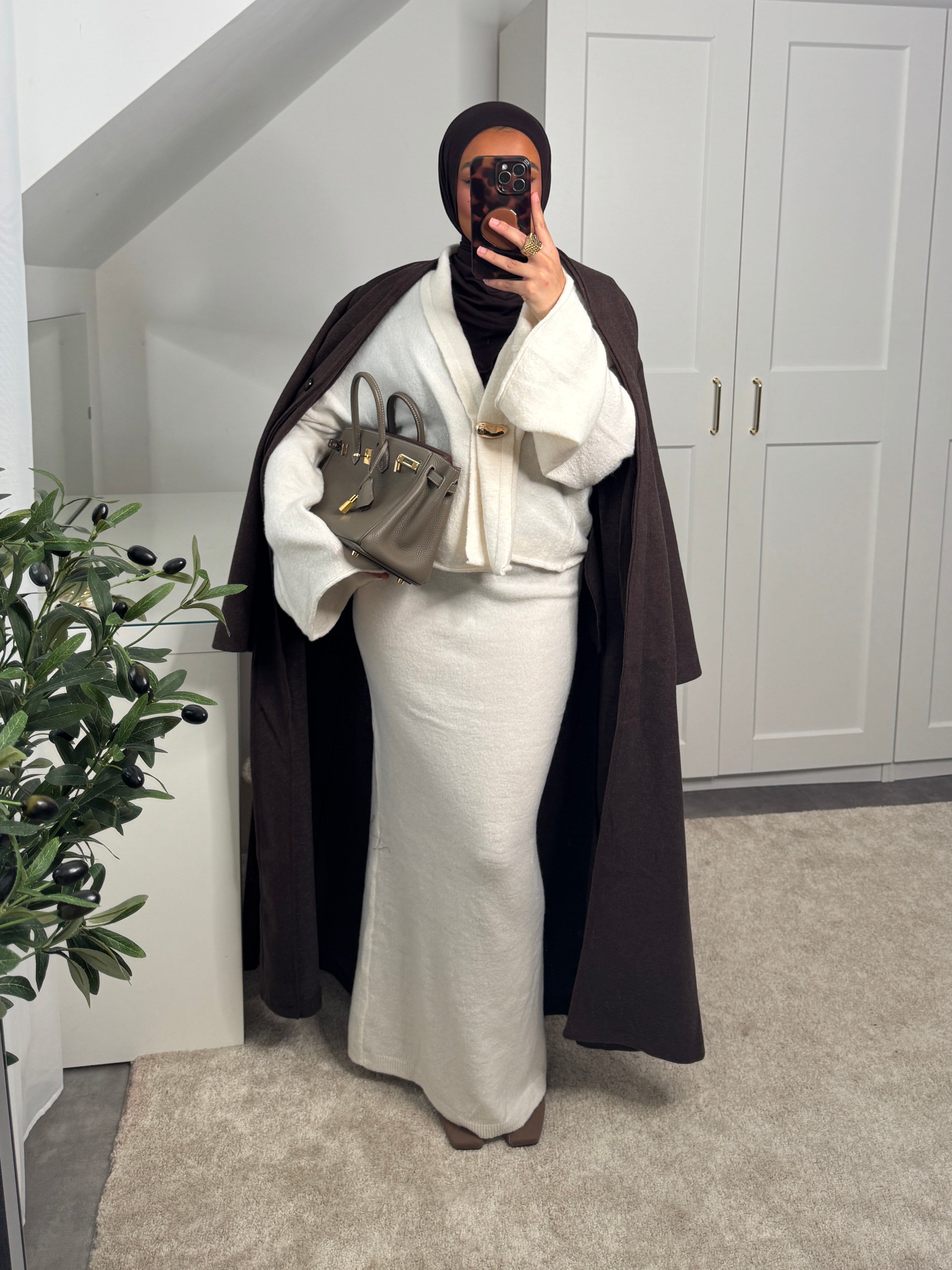Actualiser la disponibilitéSet 2 pièces - Cardigan avec épingle + jupe élastique à la taille. Matière chaude.