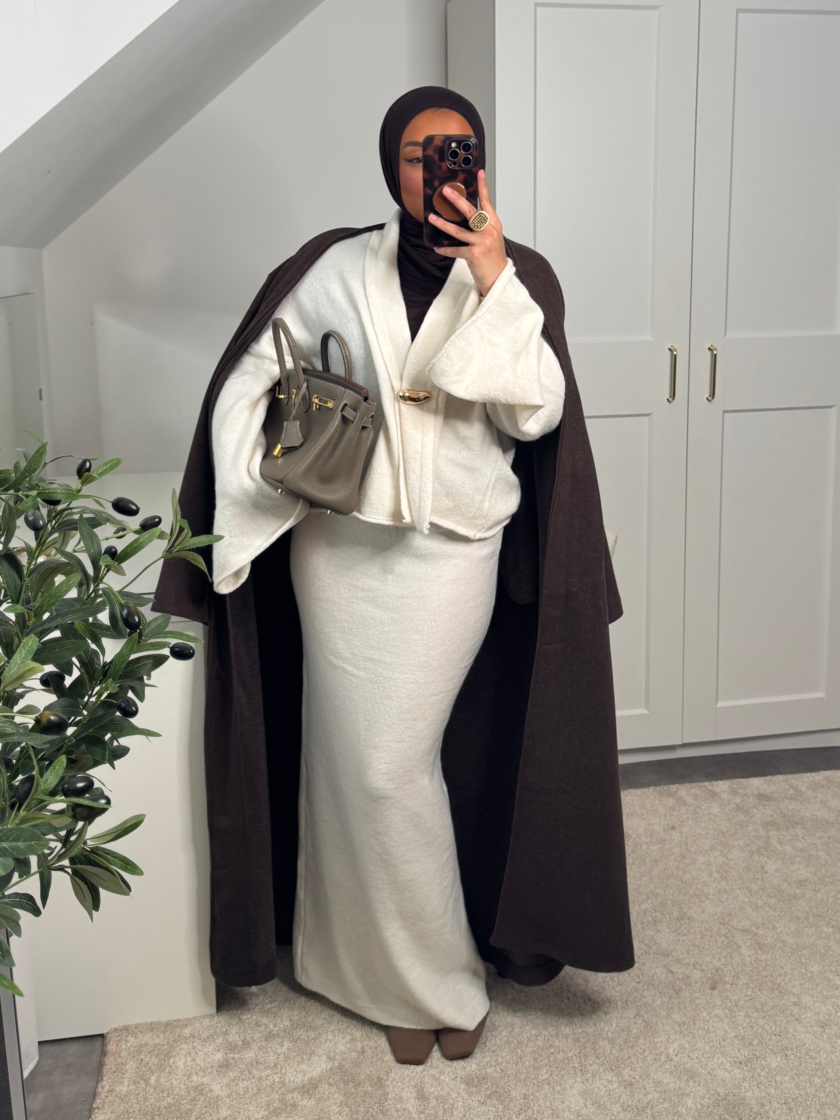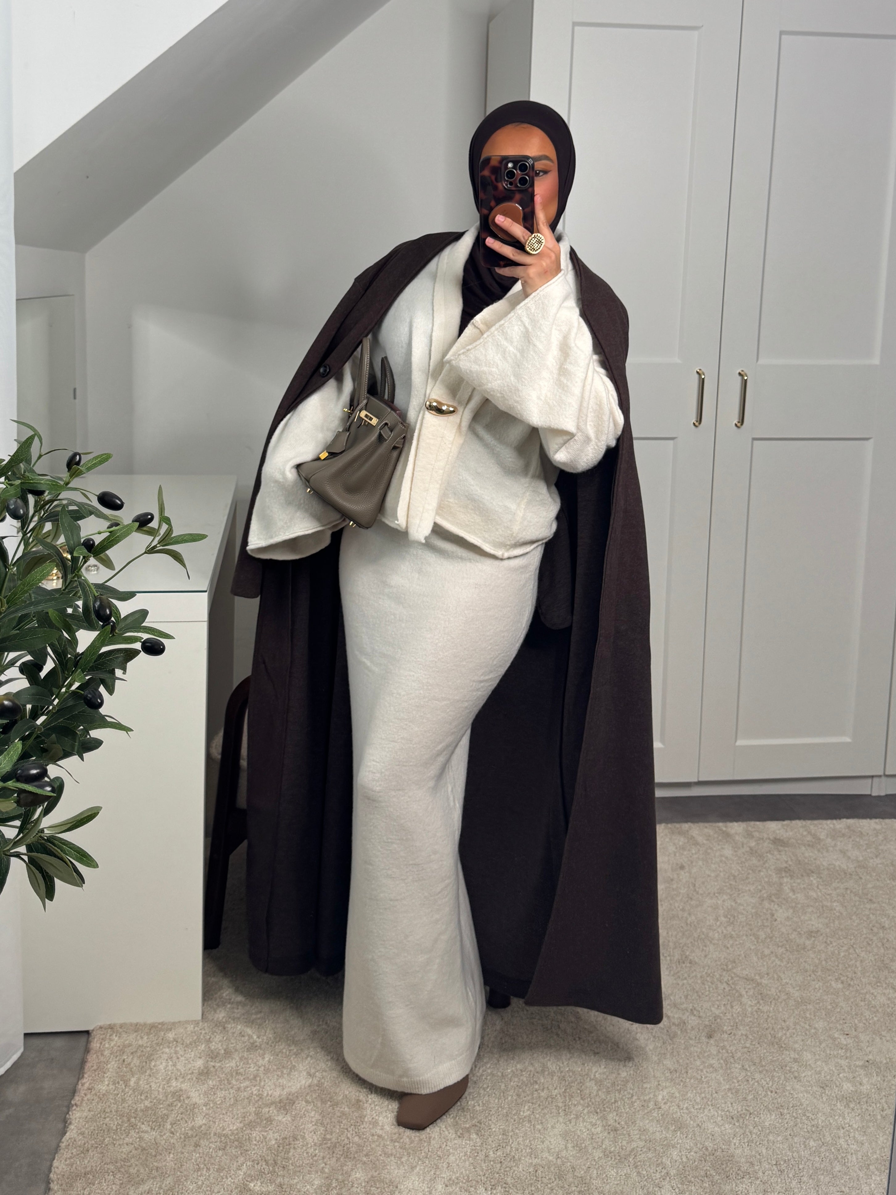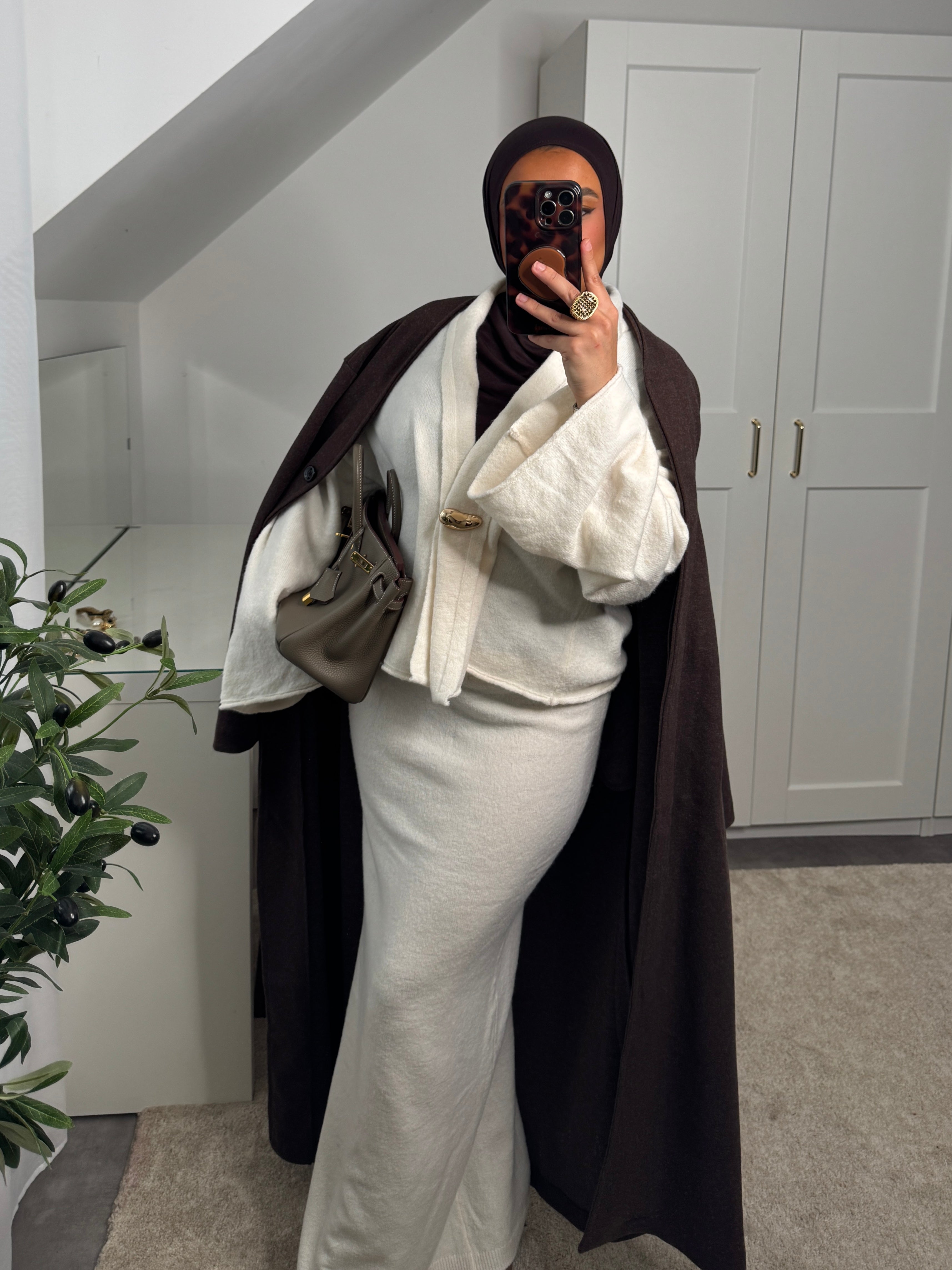 Actualiser la disponibilitéSet 2 pièces - Cardigan avec épingle + jupe élastique à la taille. Matière chaude.