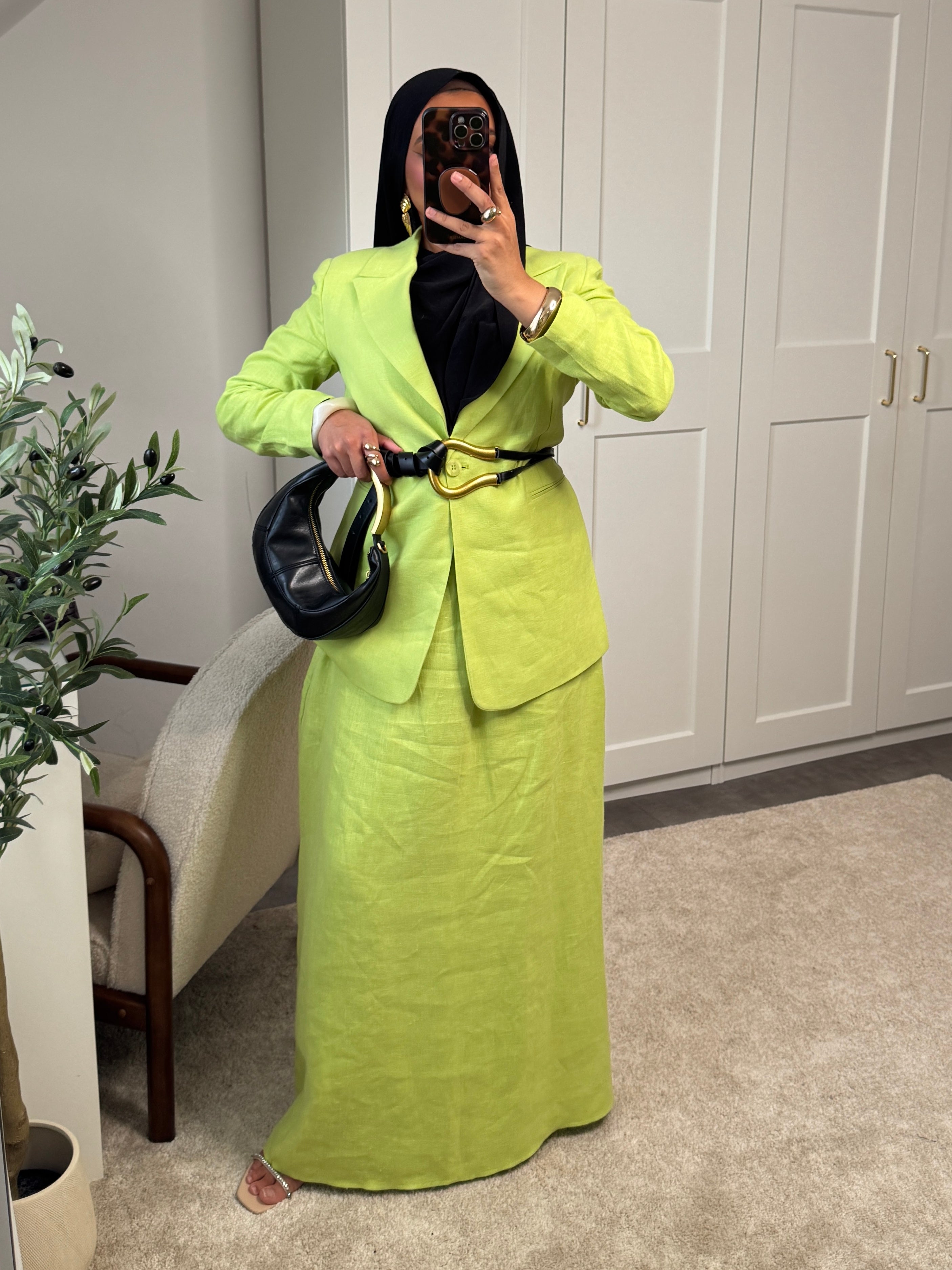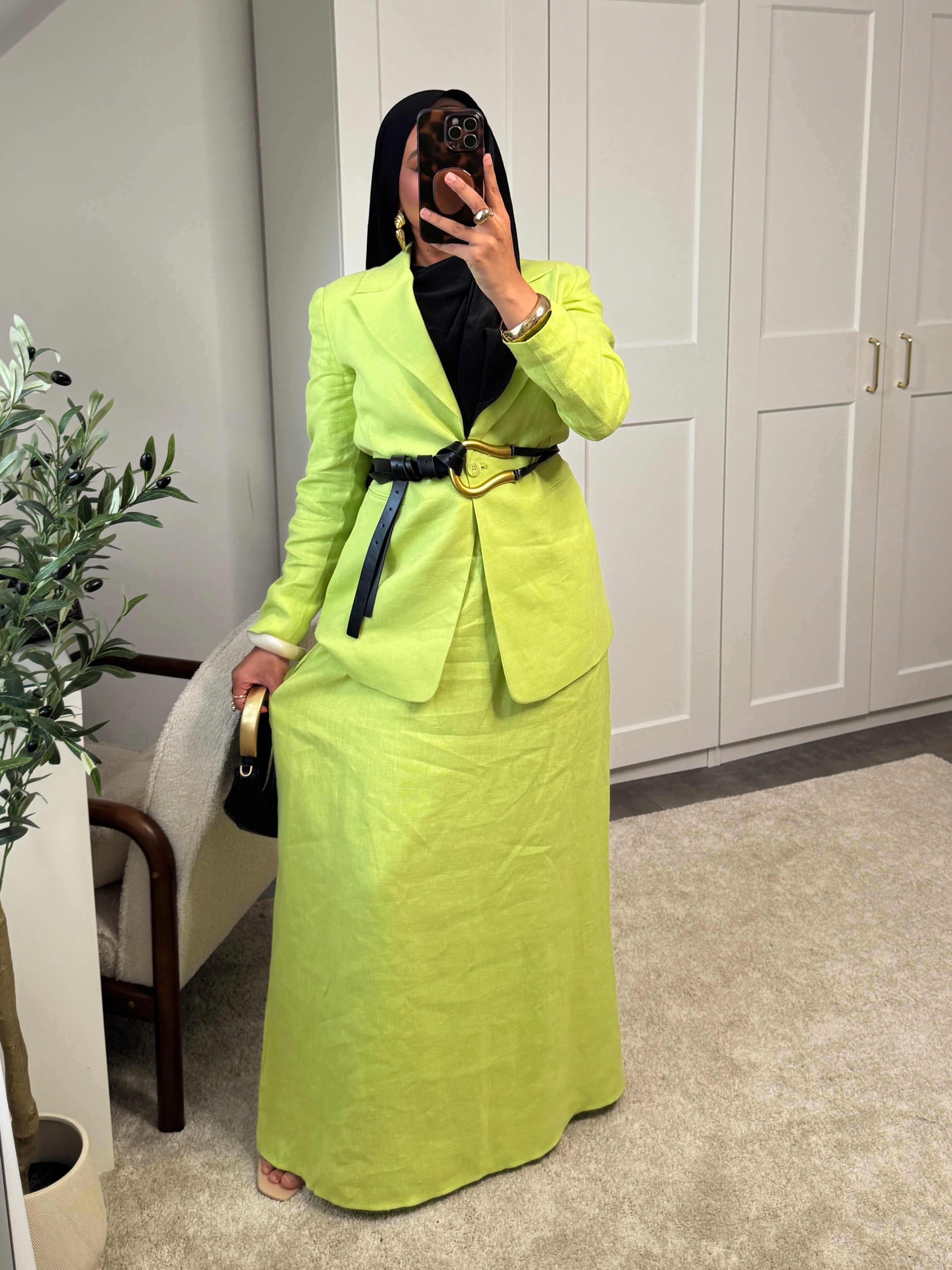 Actualiser la disponibilitéEnsemble 2 pièces : blazer coupe droite et jupe longue et large.