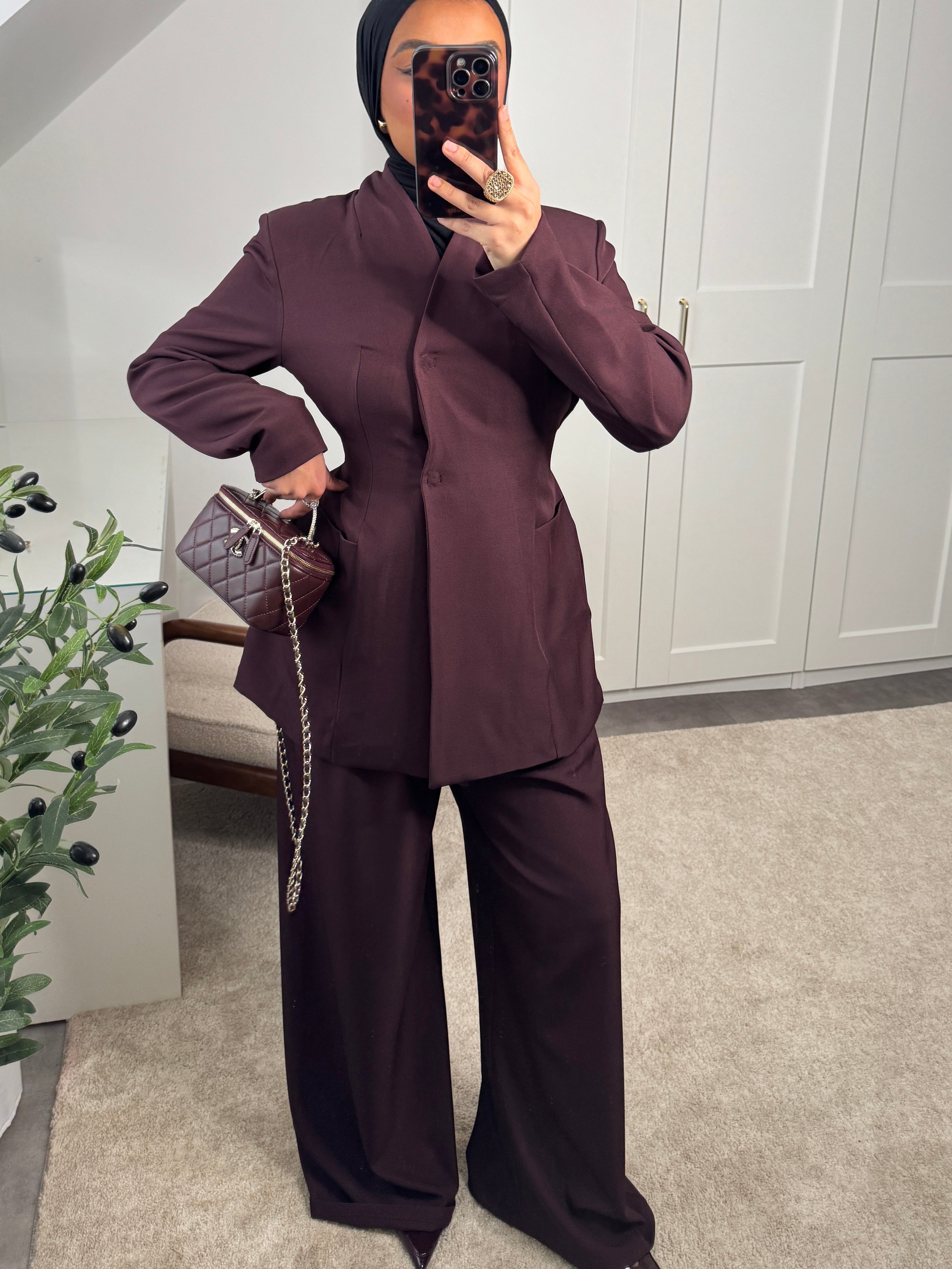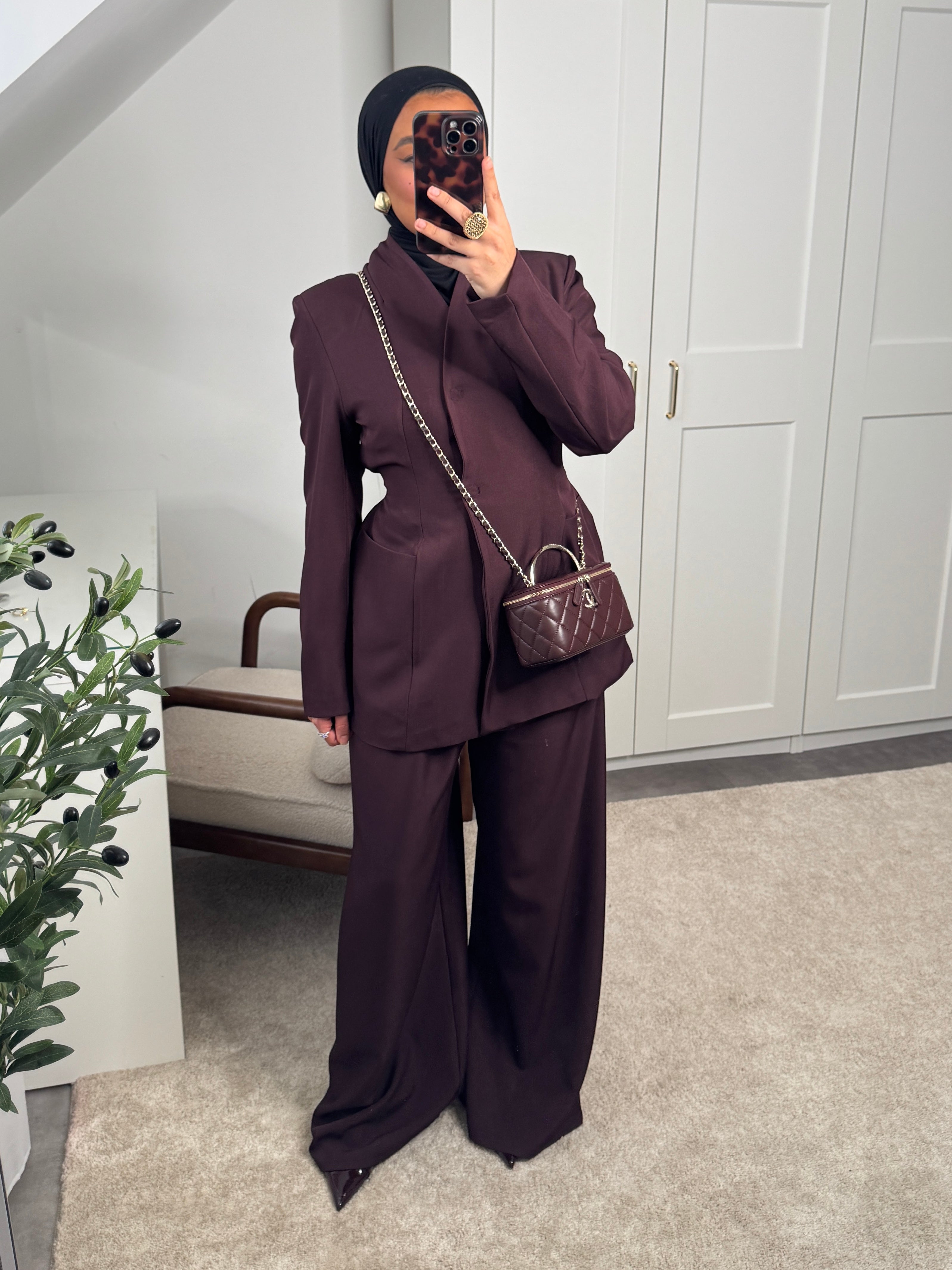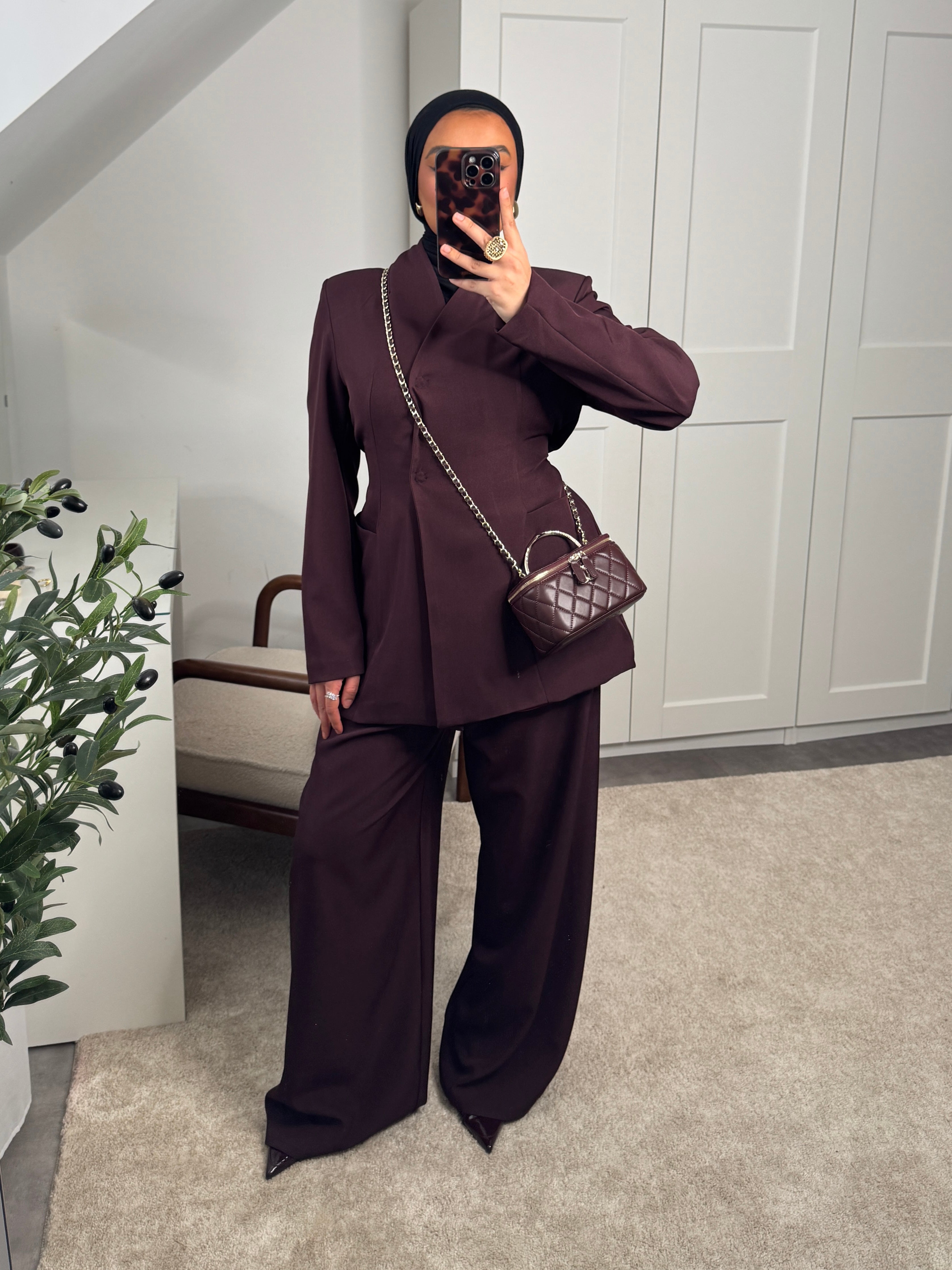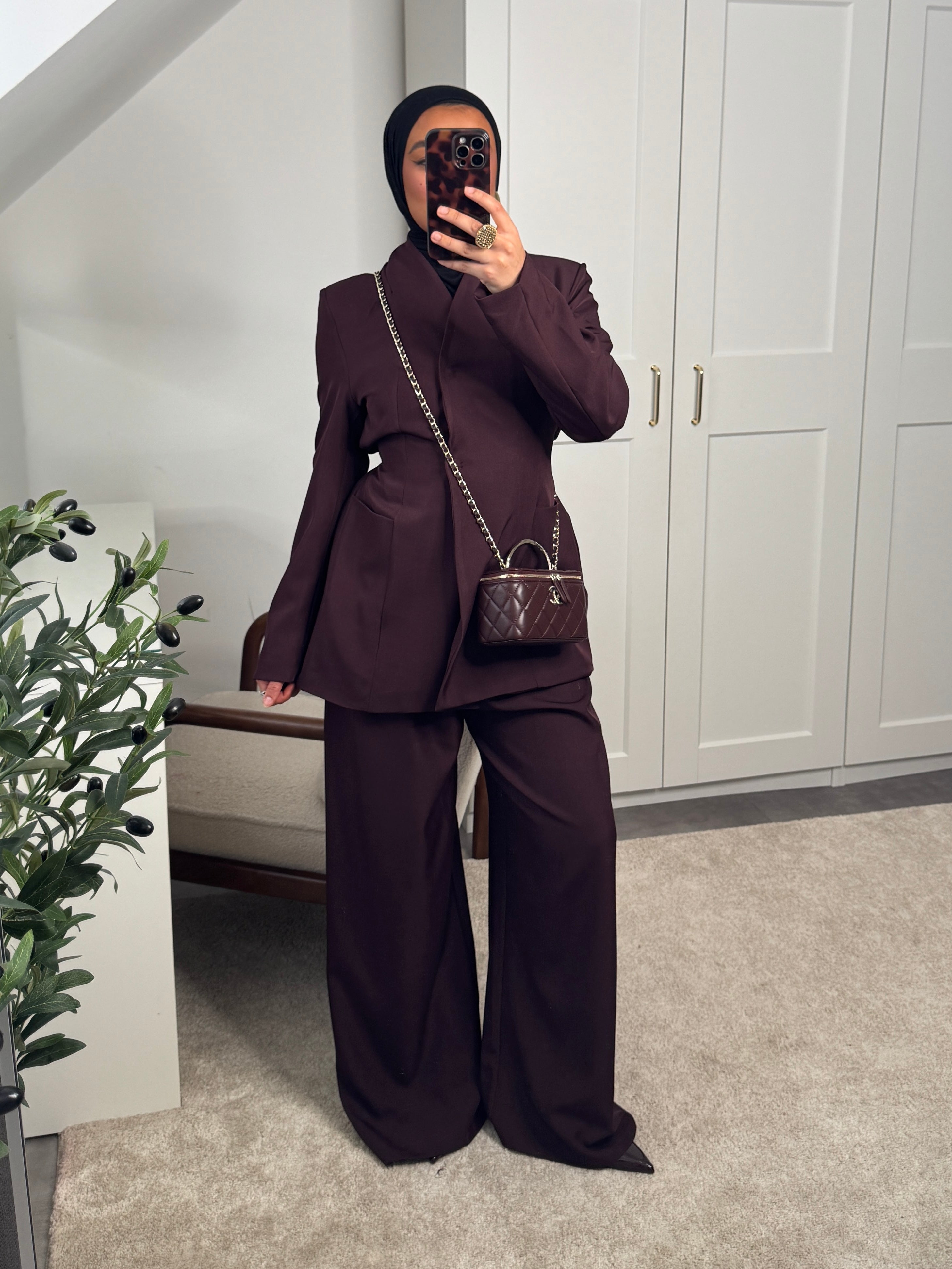 Actualiser la disponibilitéSet 2 pièces - blazer col croisé avec ceinture à l'arrière et pantalon élastique à la taille.