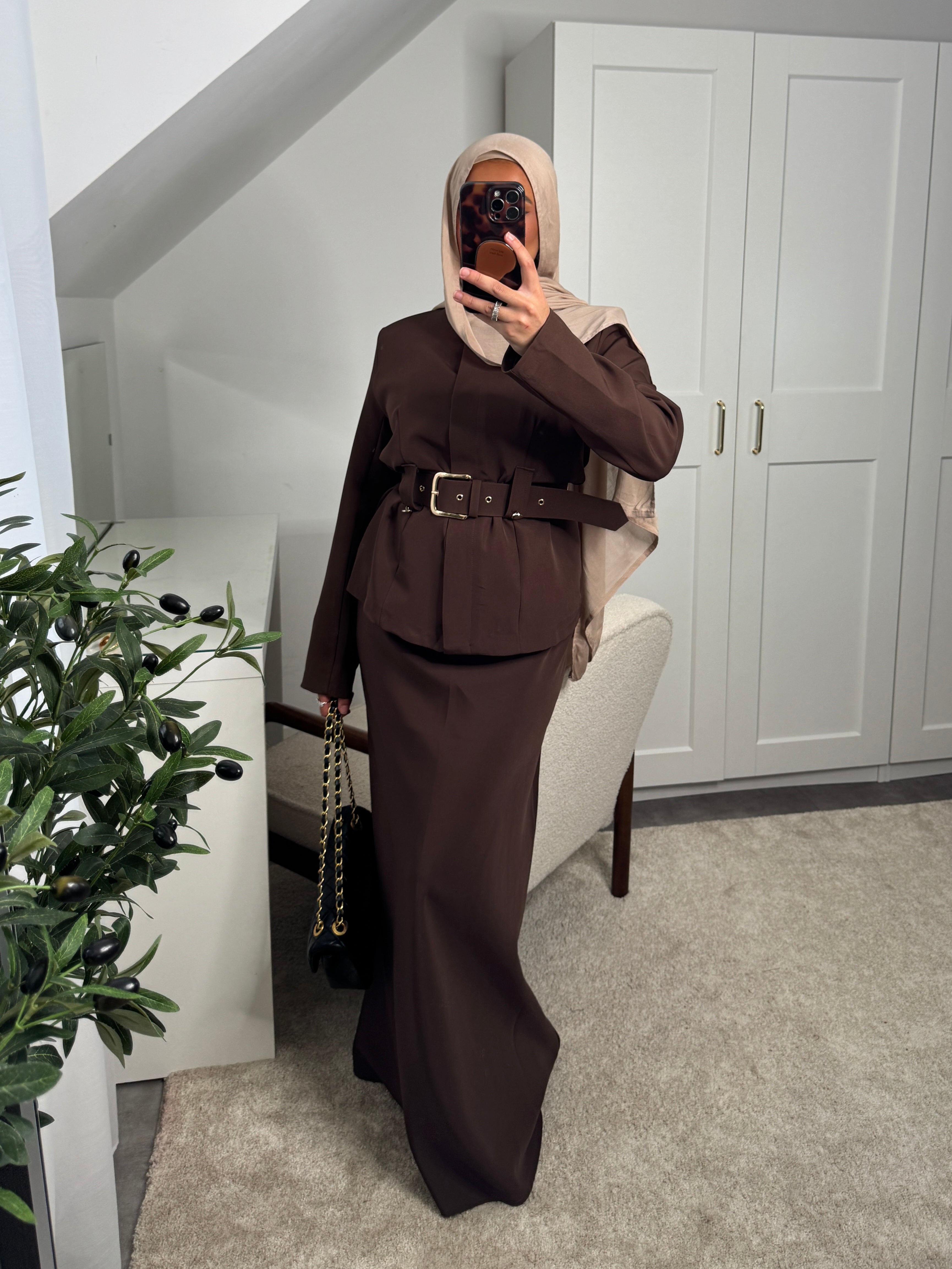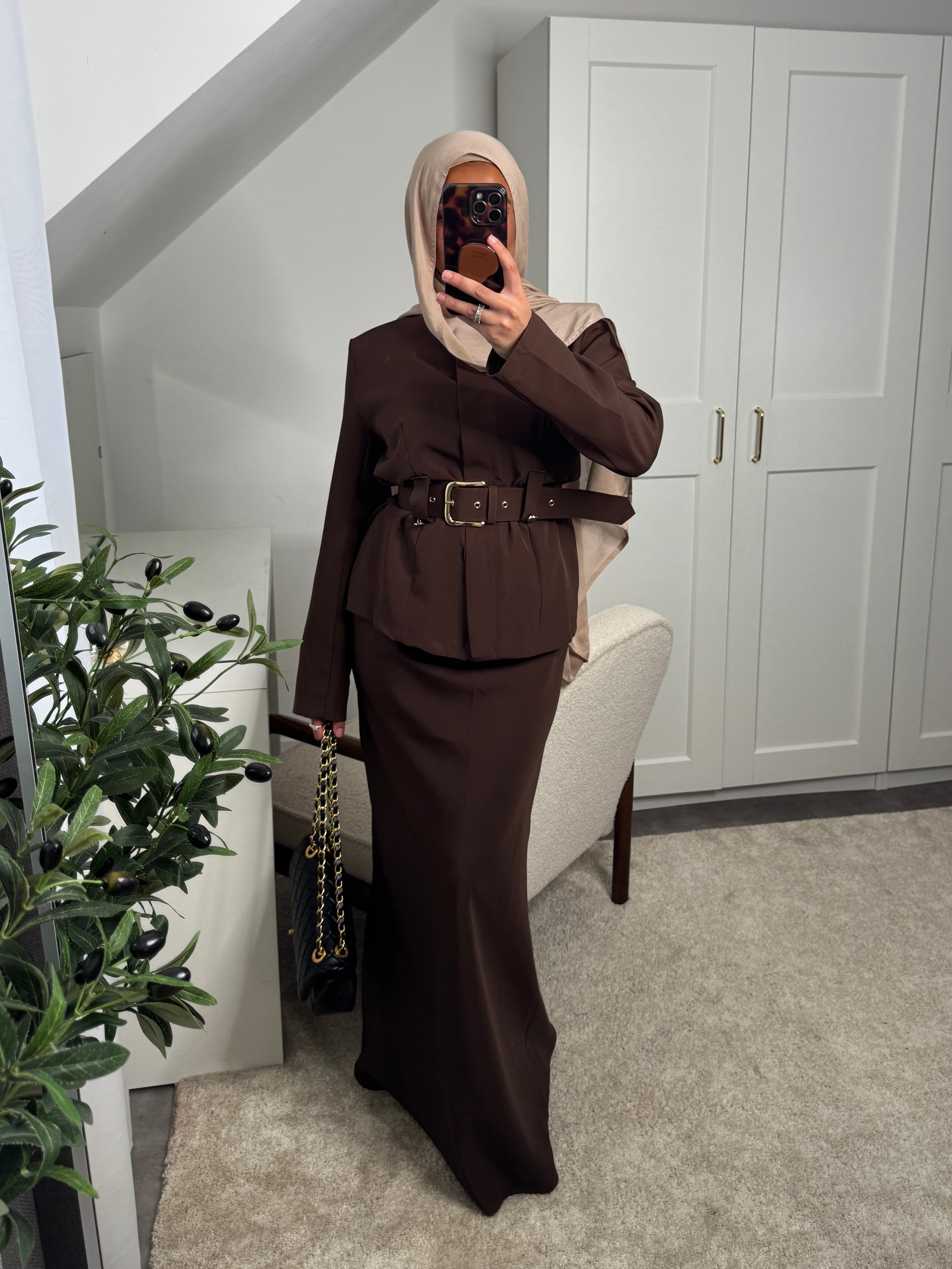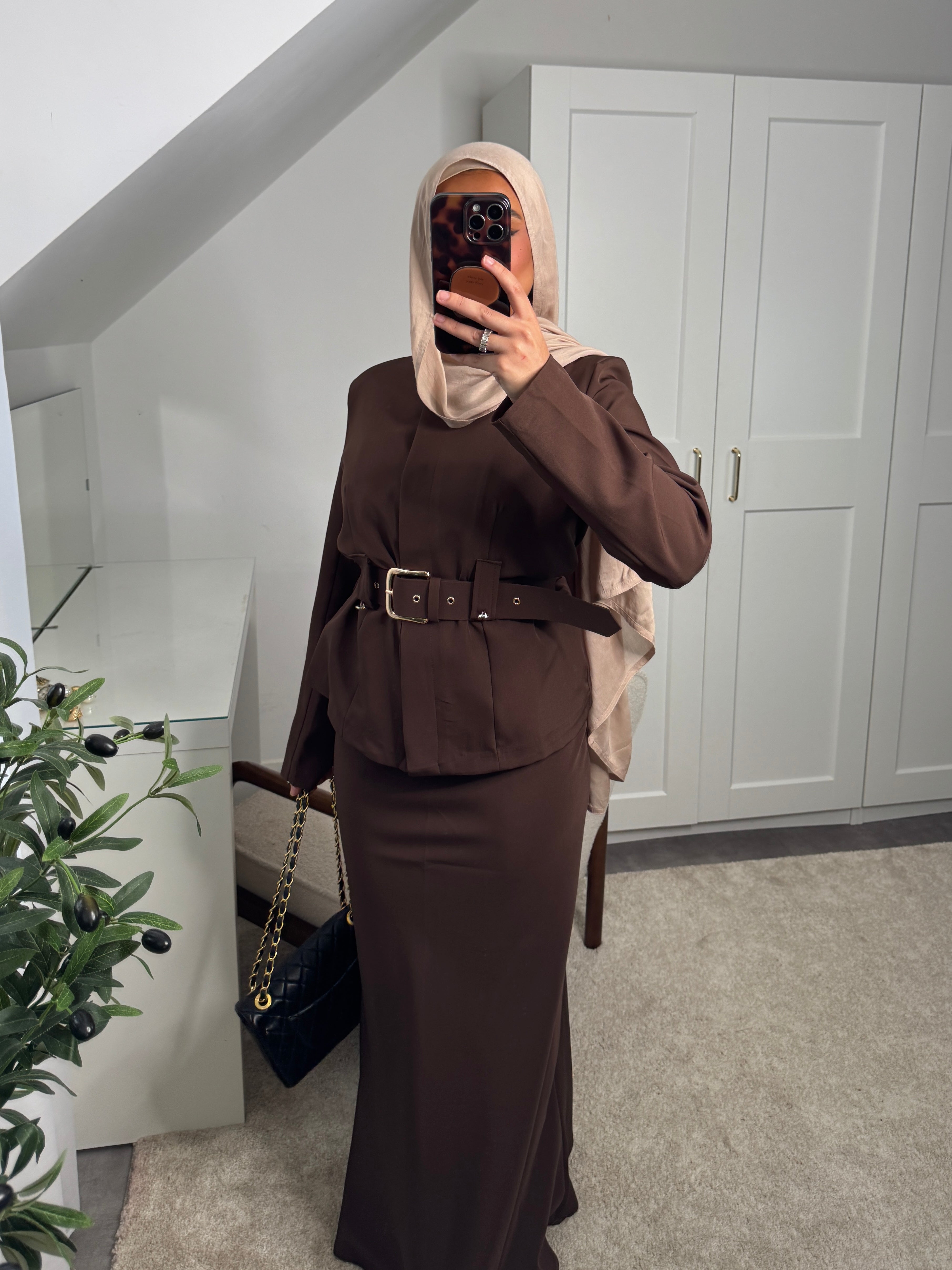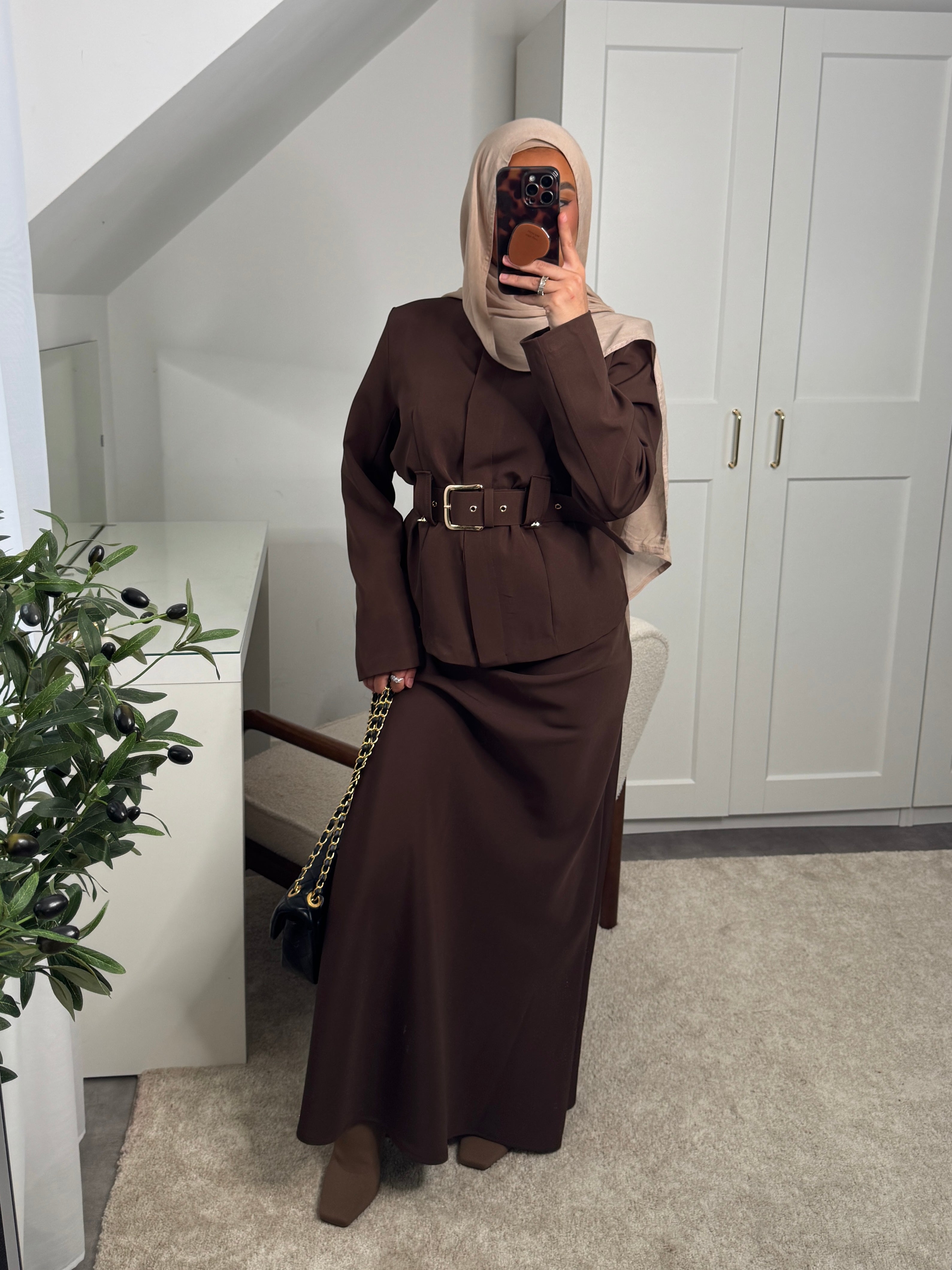 Actualiser la disponibilitéSet 2 pièces : haut à boutons invisibles + ceinture et jupe longue élastique à la taille.