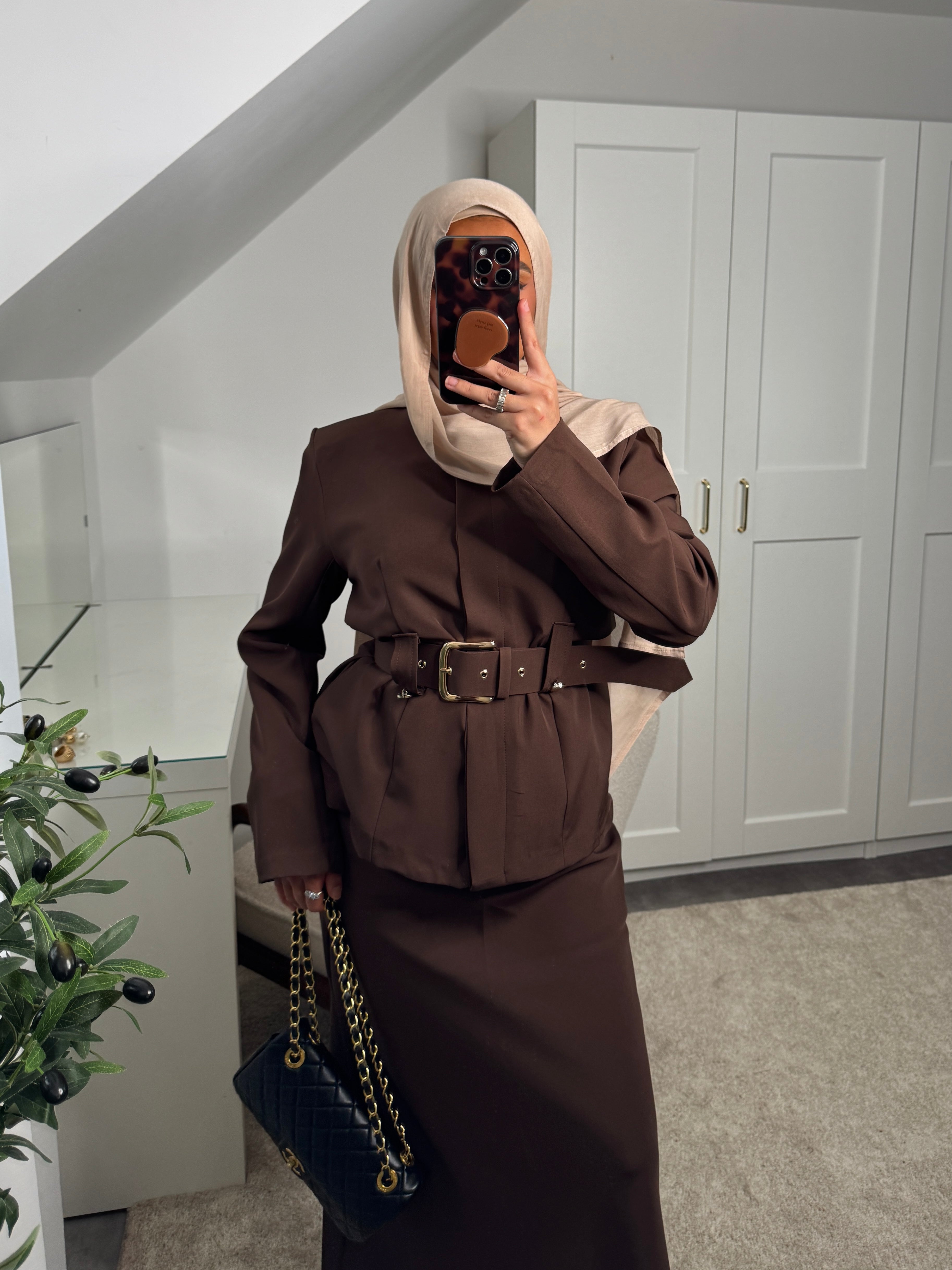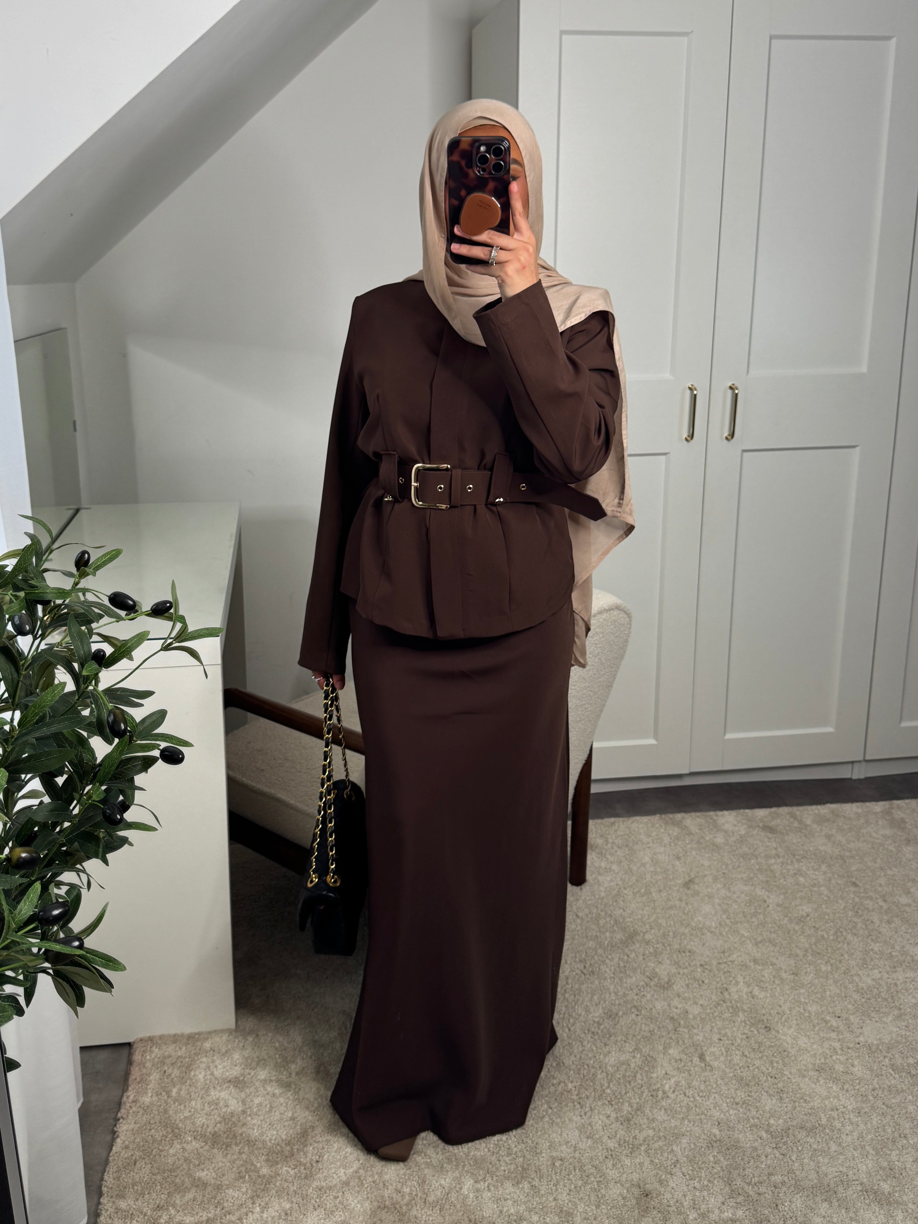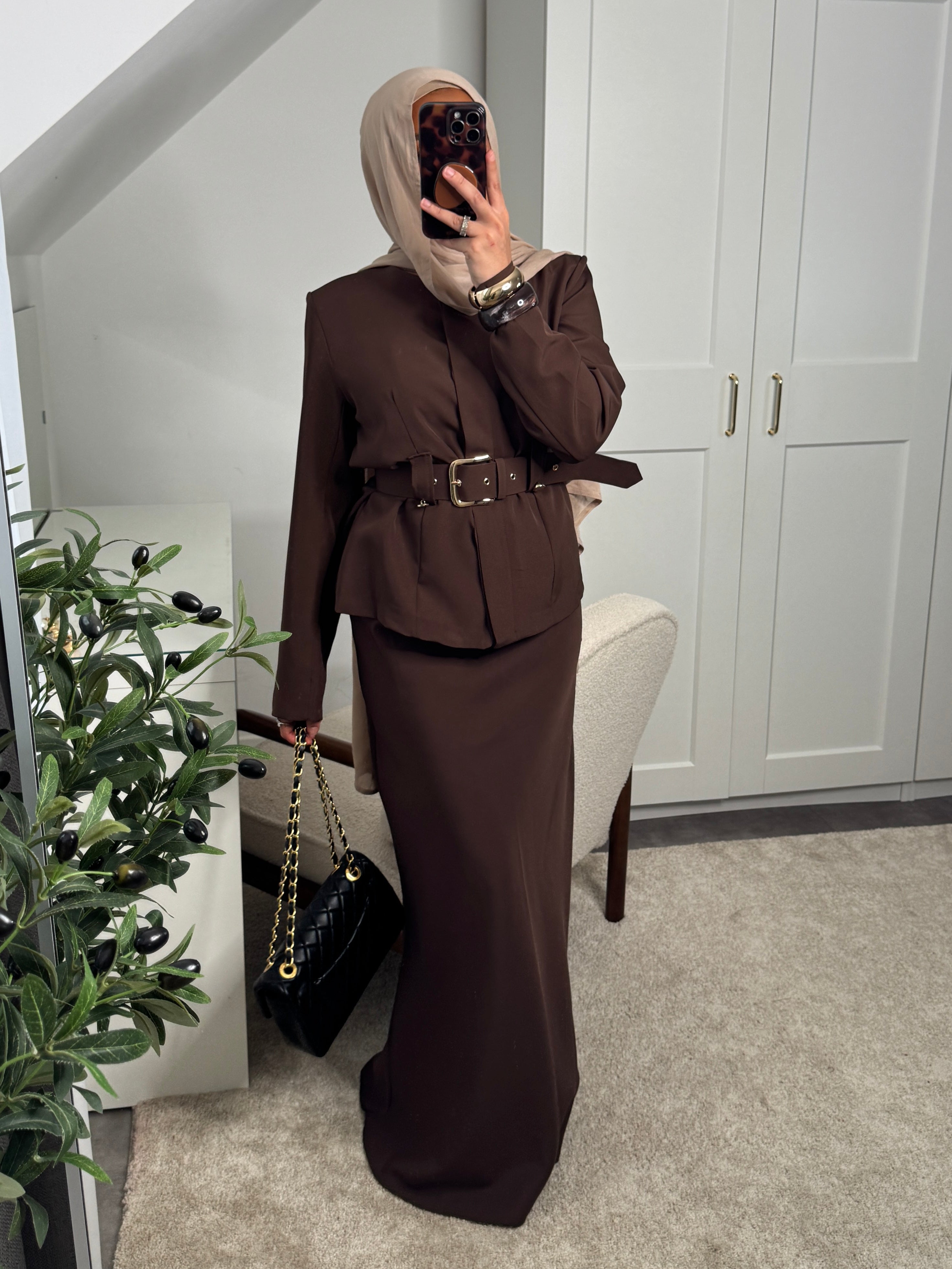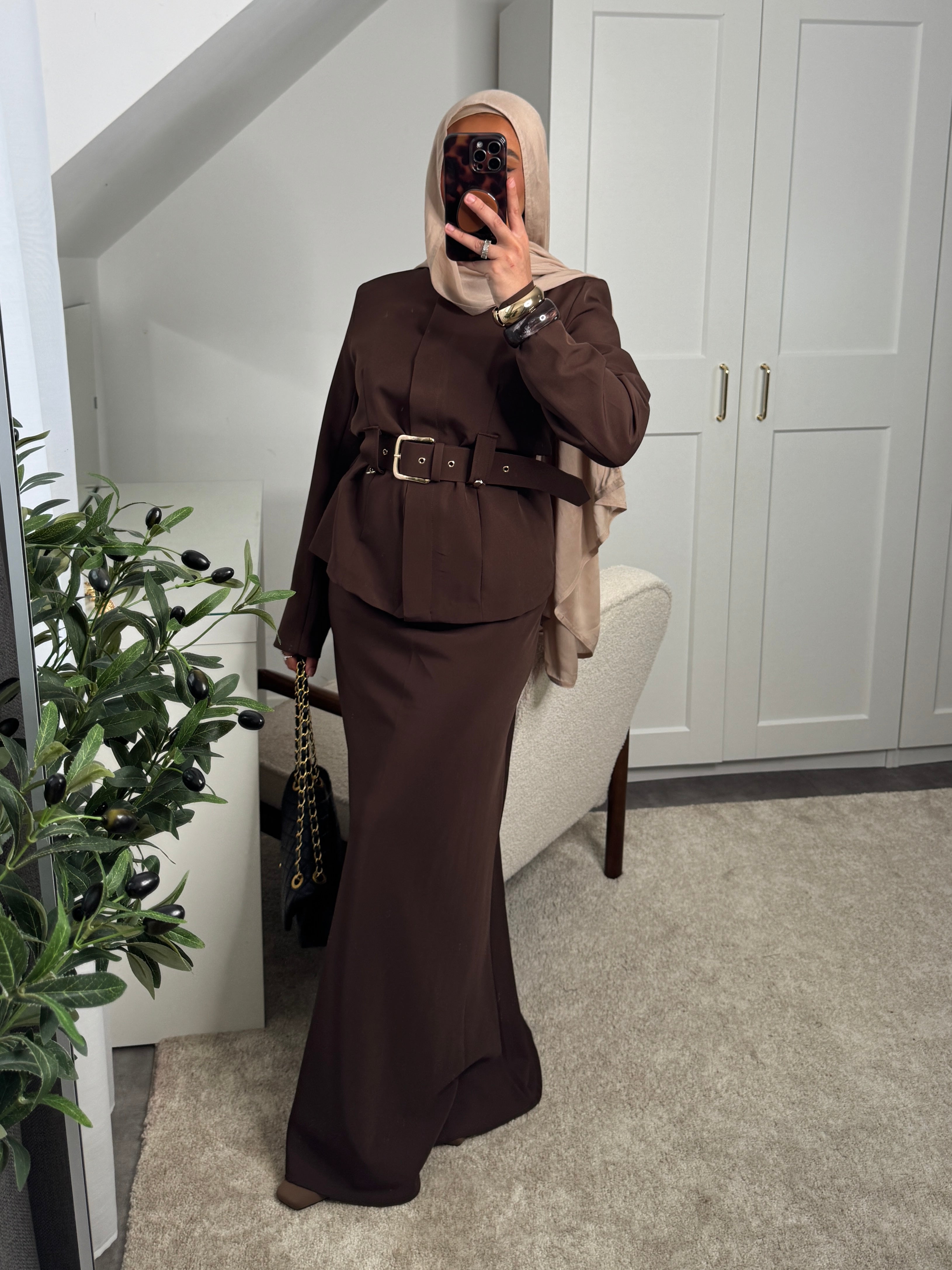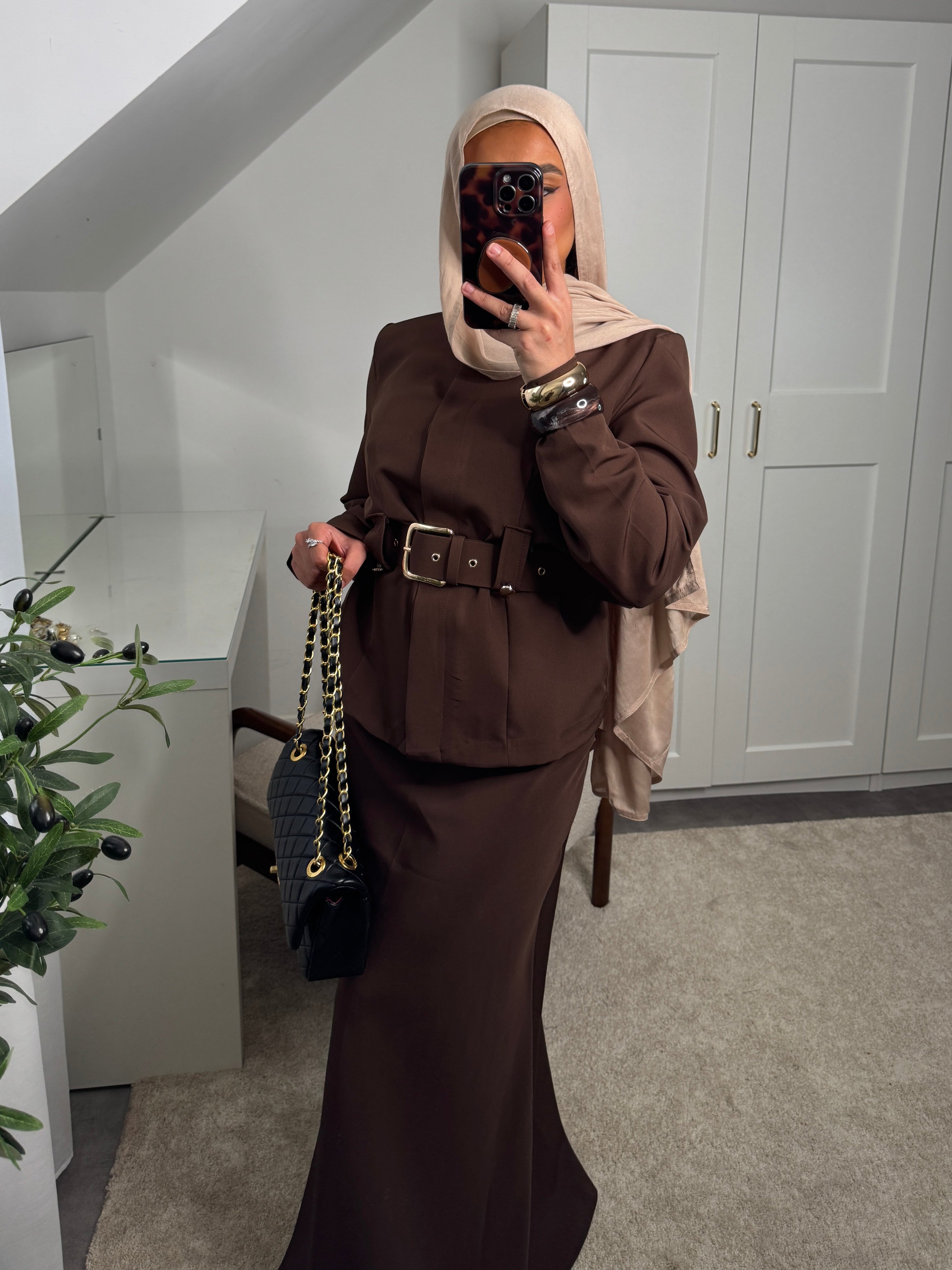 Actualiser la disponibilitéSet 2 pièces : haut à boutons invisibles + ceinture et jupe longue élastique à la taille.