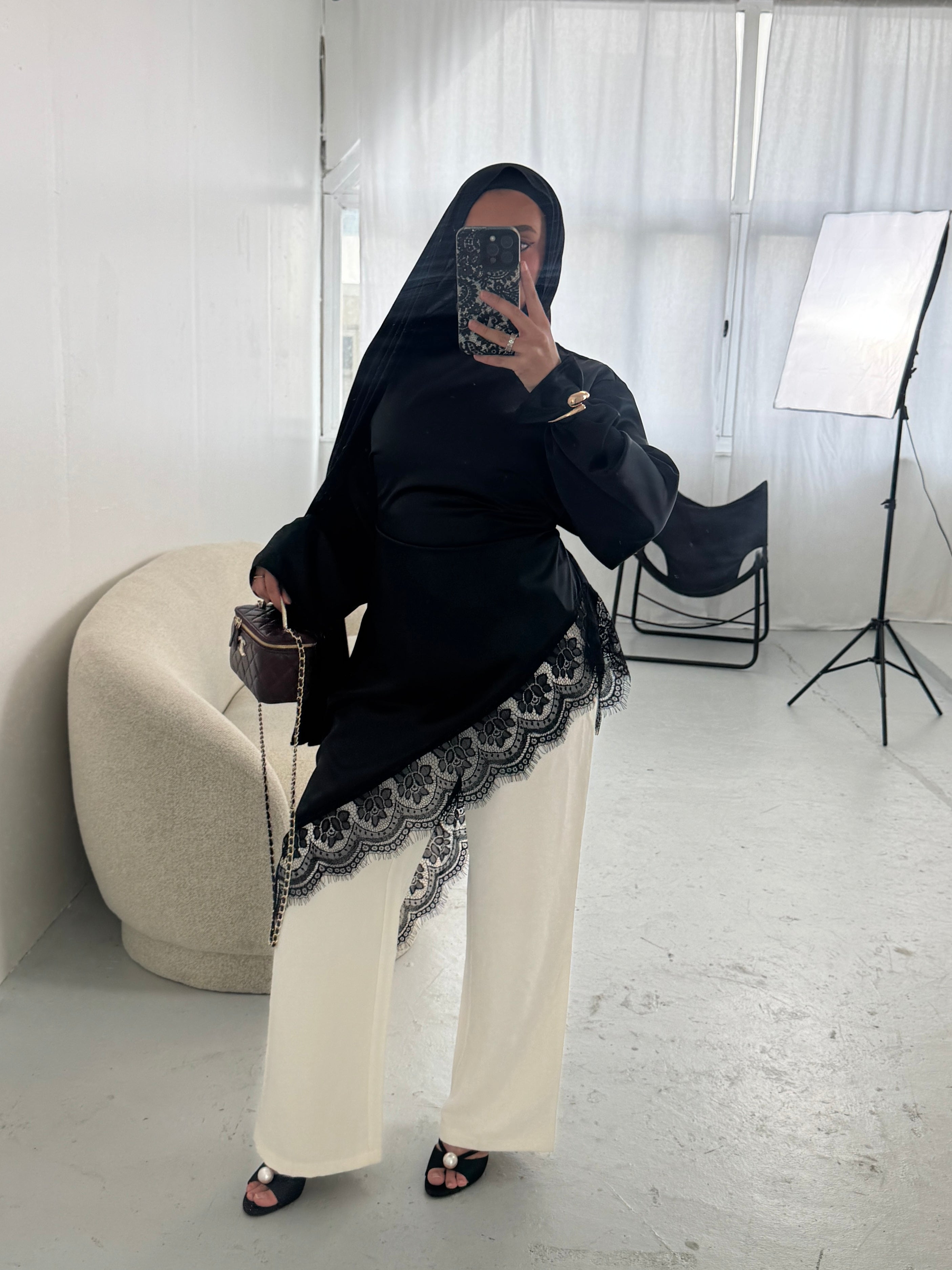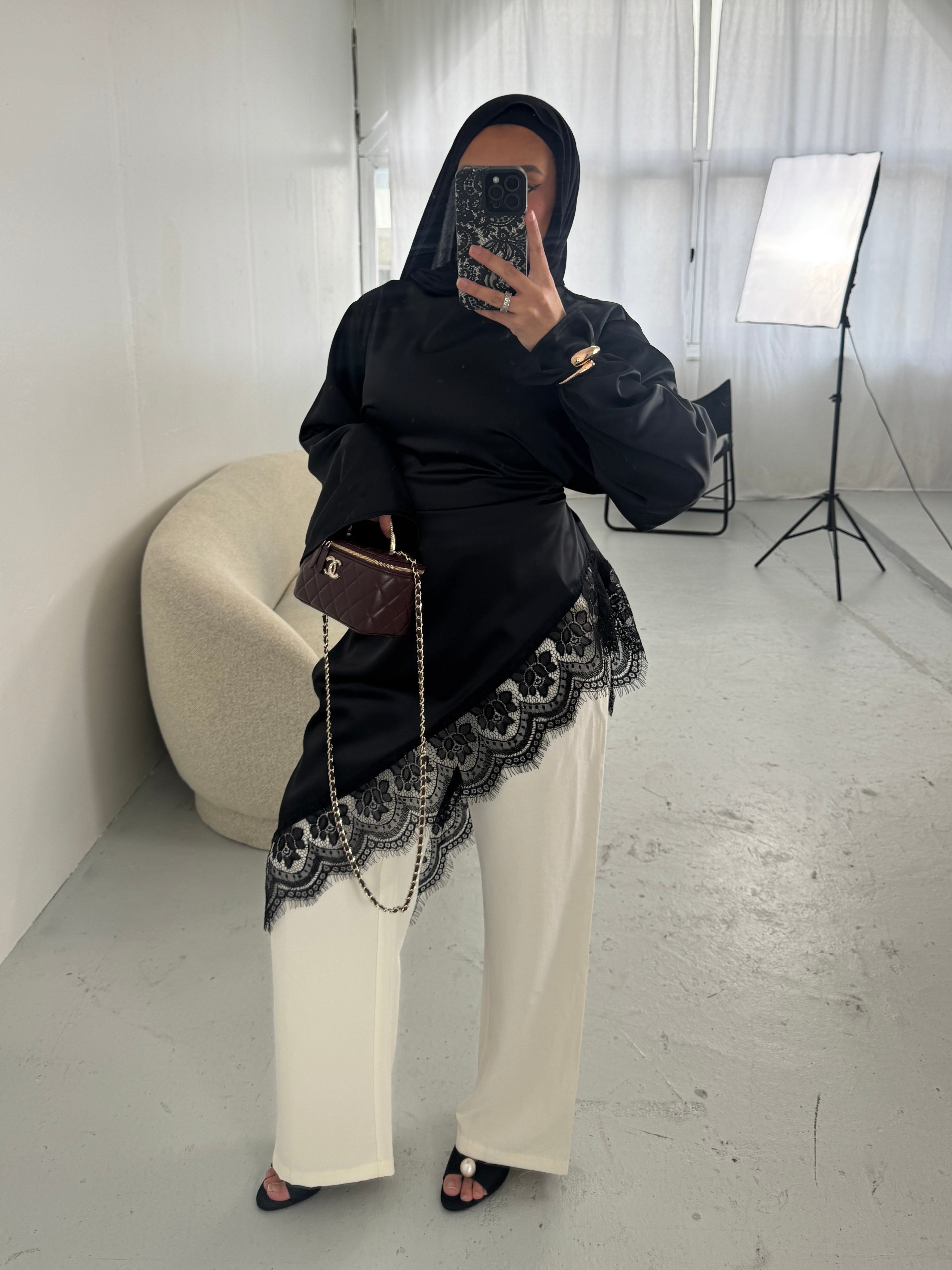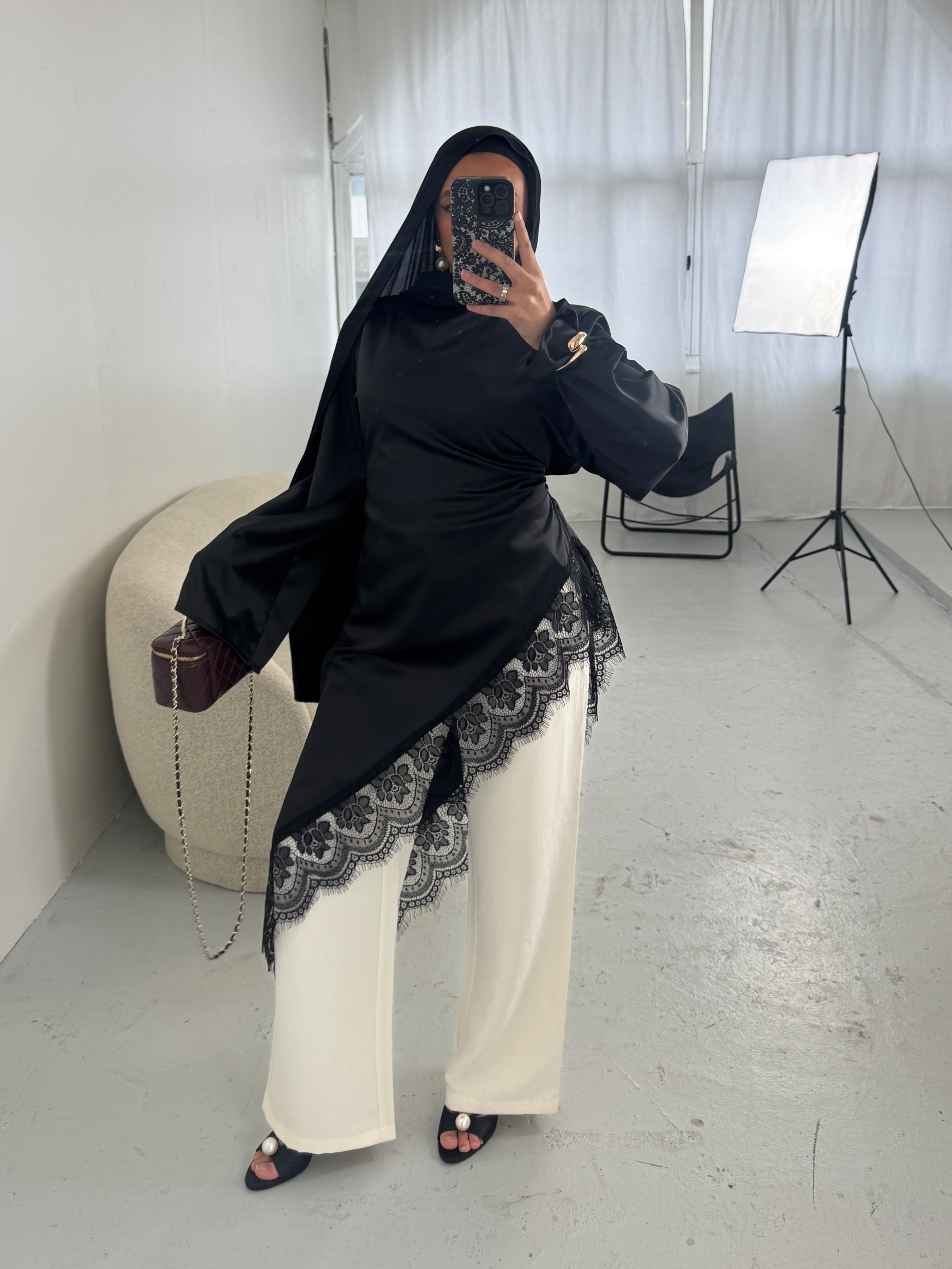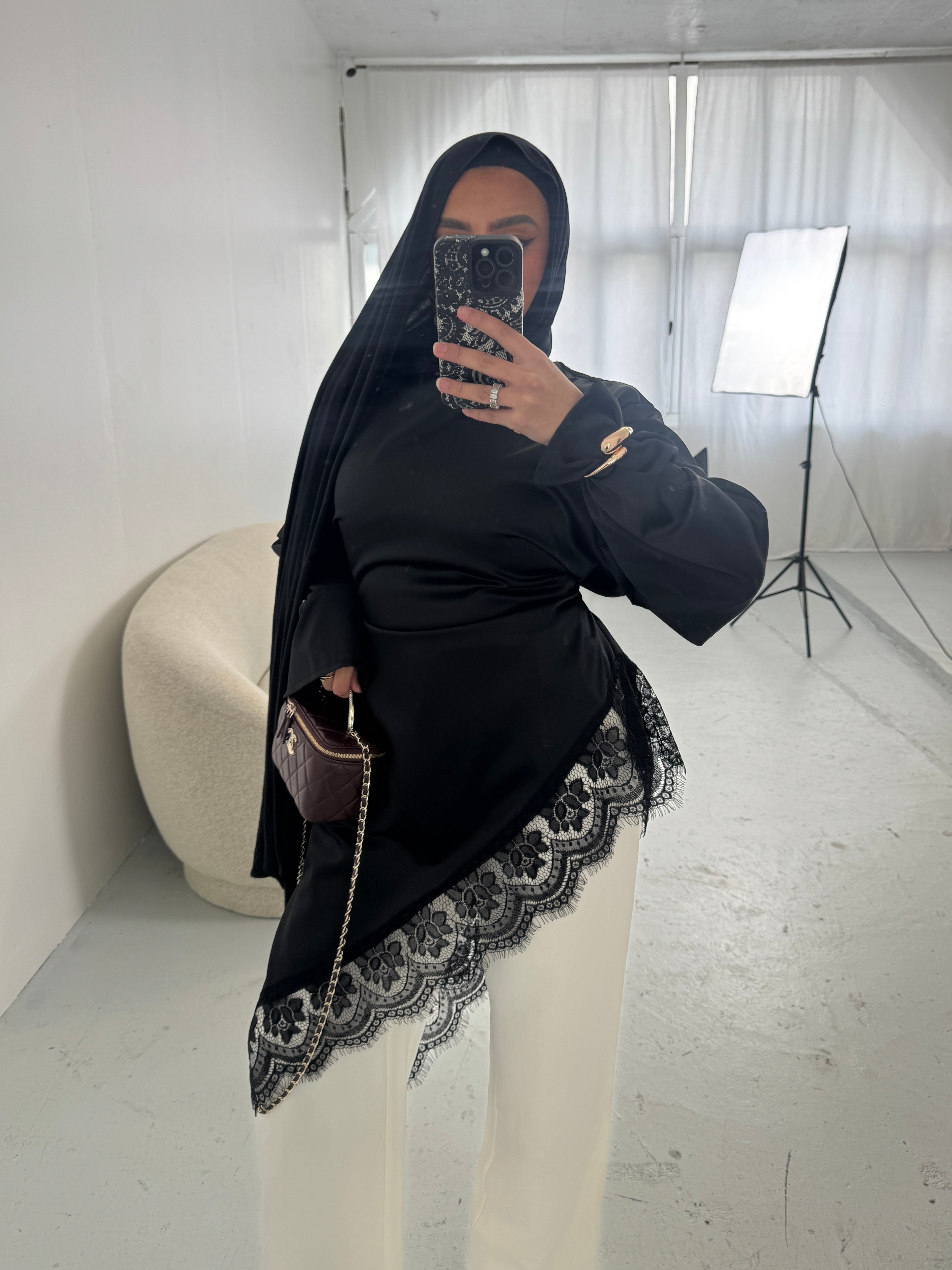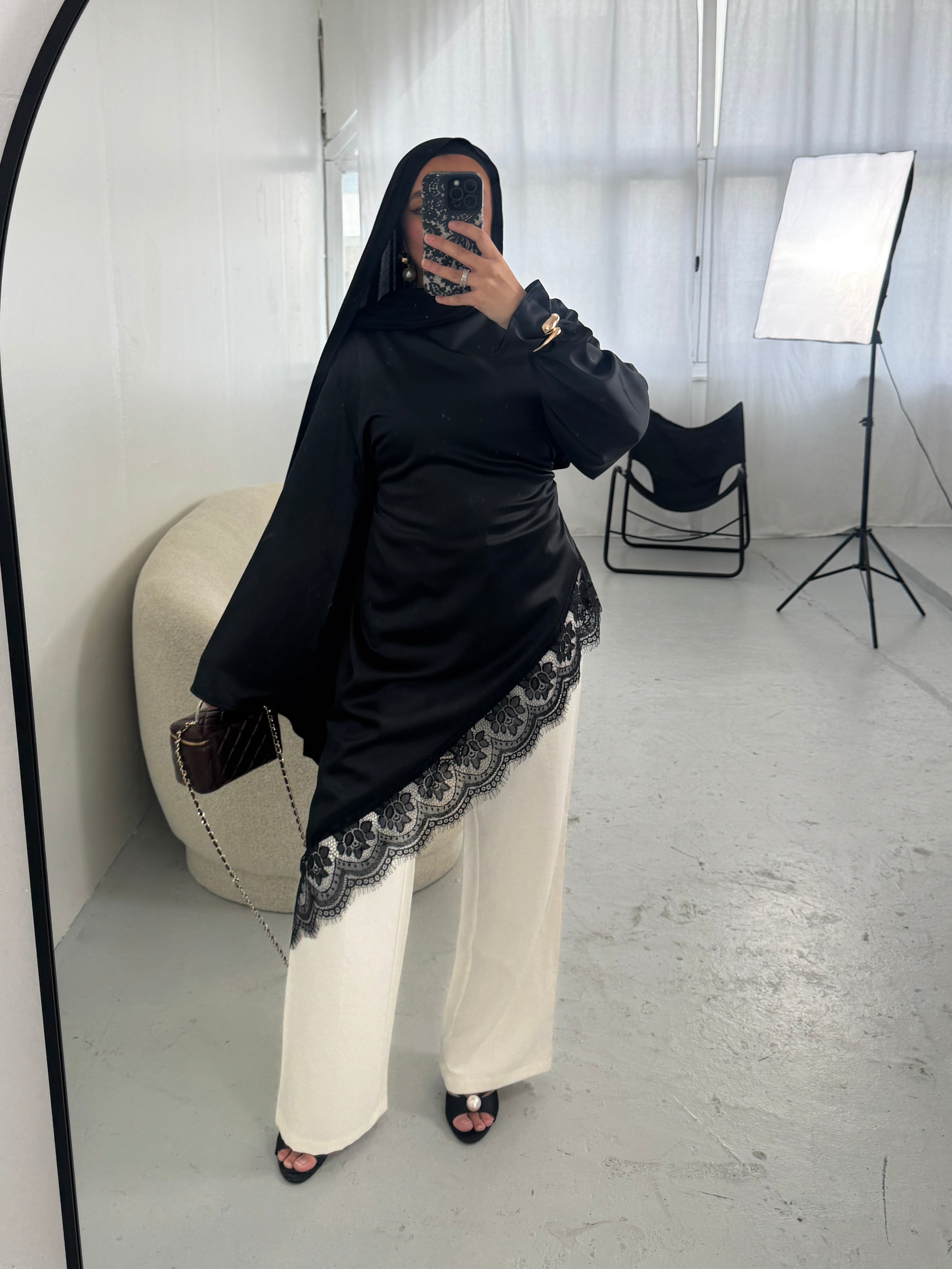 TOP LONG ASYMÉTRIQUE À DENTELLES NOIR